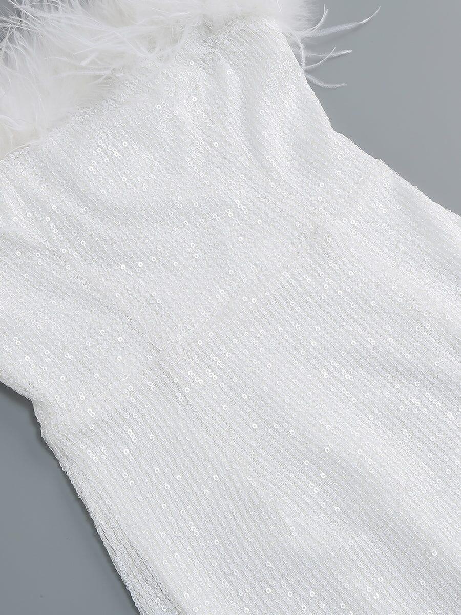 Introducing our Ostrich Hair Decorative Bandeau Maxi Dress in White, a dress that combines impeccable fabric, exquisite cut, and enchanting details. With its sleeveless design, this dress beautifully showcases your slender necklines and round shoulders, exuding a strong sense of femininity.