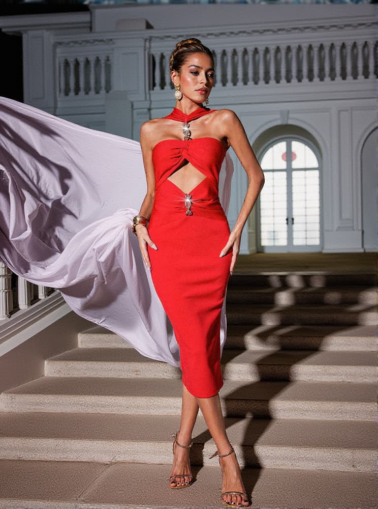 Indulge in luxury with our Ozzie Cutout Ruched Bandage Dress. Designed with intricate cutouts and ruched details, this dress is perfect for making a statement. Its bandage material hugs your curves and enhances your silhouette, giving you a figure that exudes elegance and sophistication. Elevate your wardrobe with this exclusive piece.