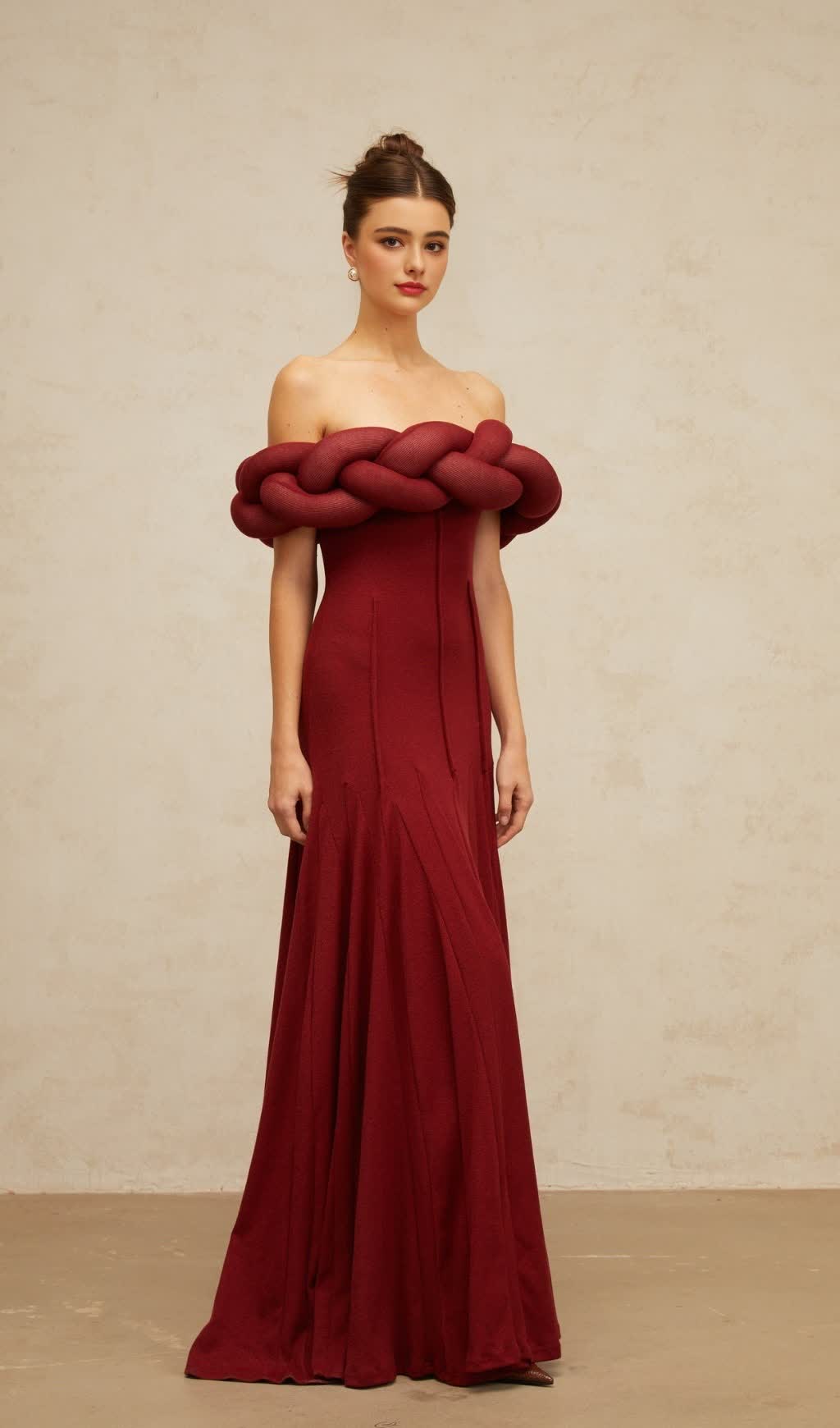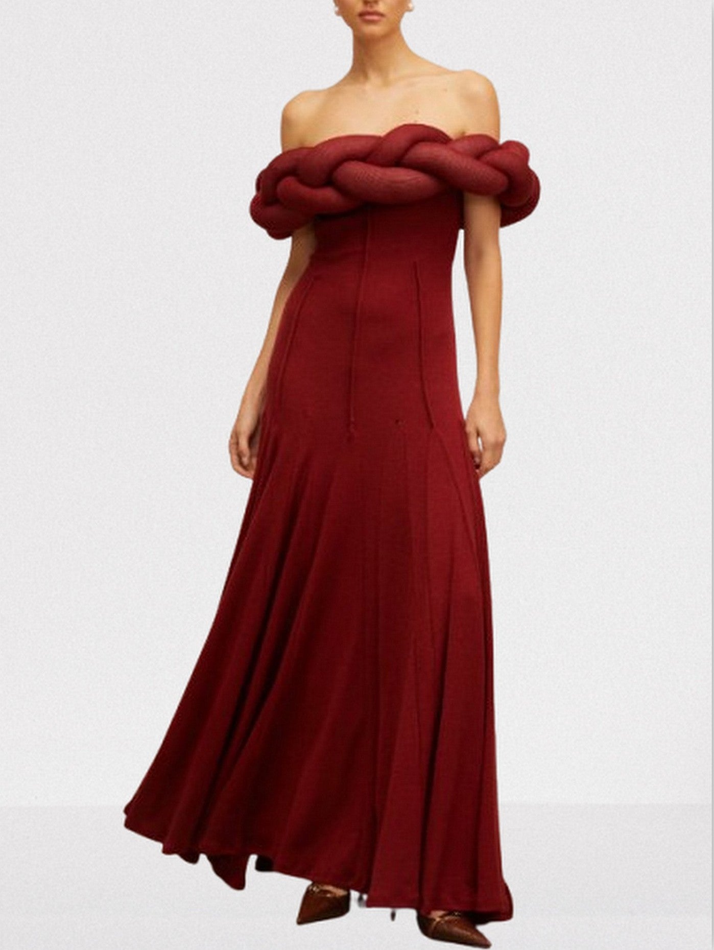 This burgundy padded braided off-shoulder maxi dress combines elegant design with comfortable support. The padded braids enhance the neckline while providing structure, and the off-shoulder style adds a sophisticated, feminine touch. Crafted for a flattering fit, this maxi dress flows gracefully, making it ideal for formal occasions or stylish evening events.