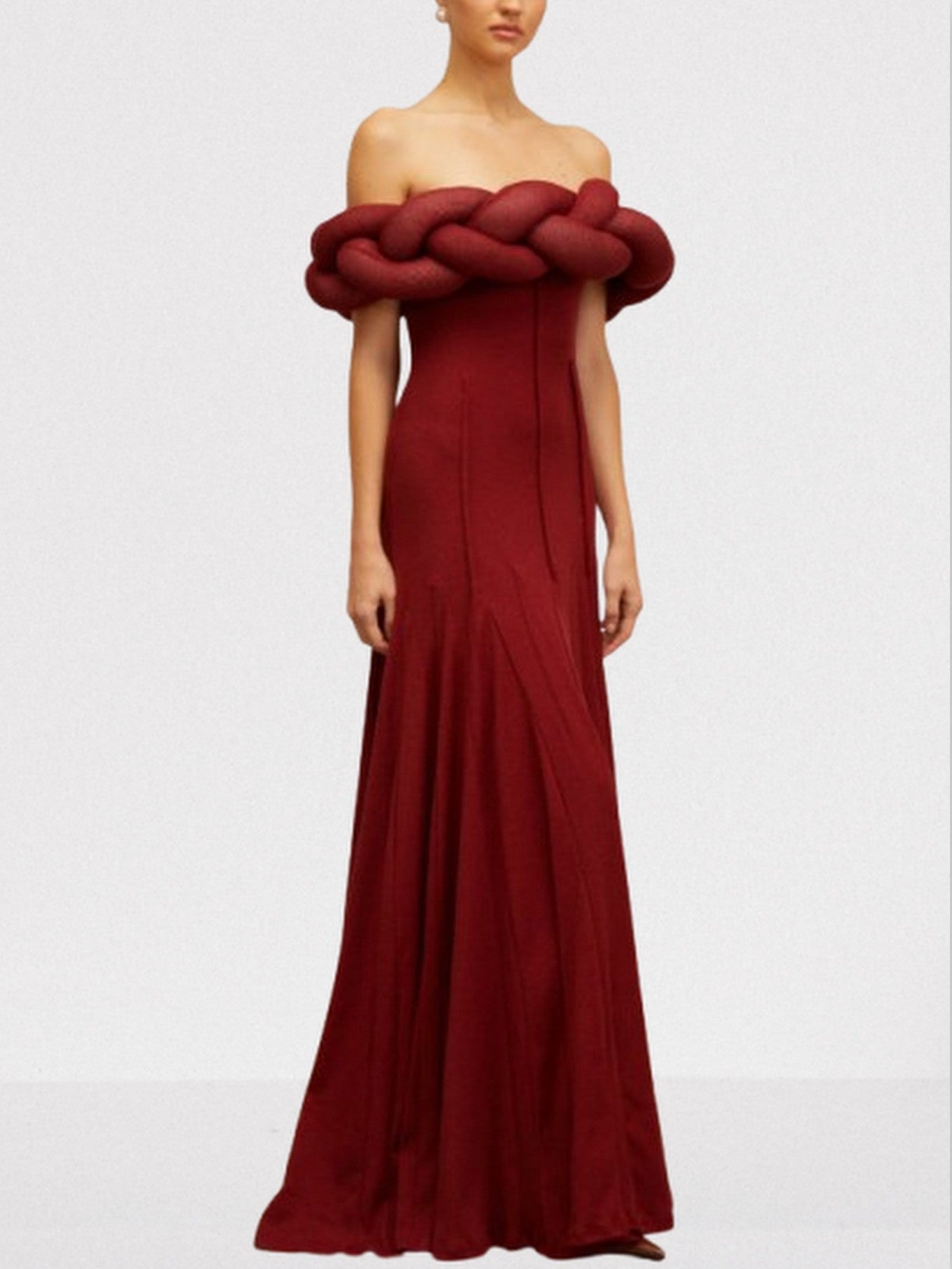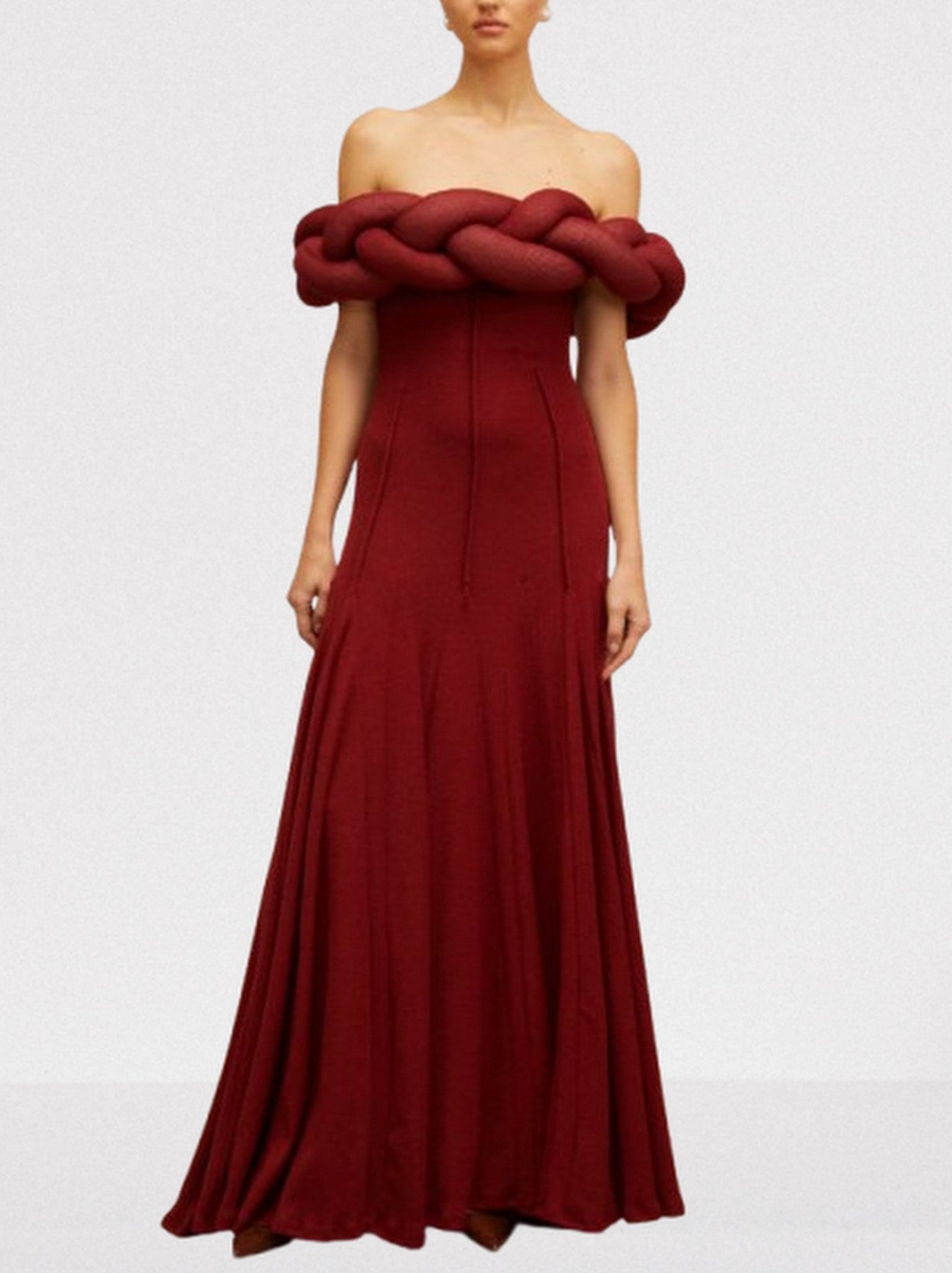 Padded Braided Off-Shoulder Maxi Dress in burgundy