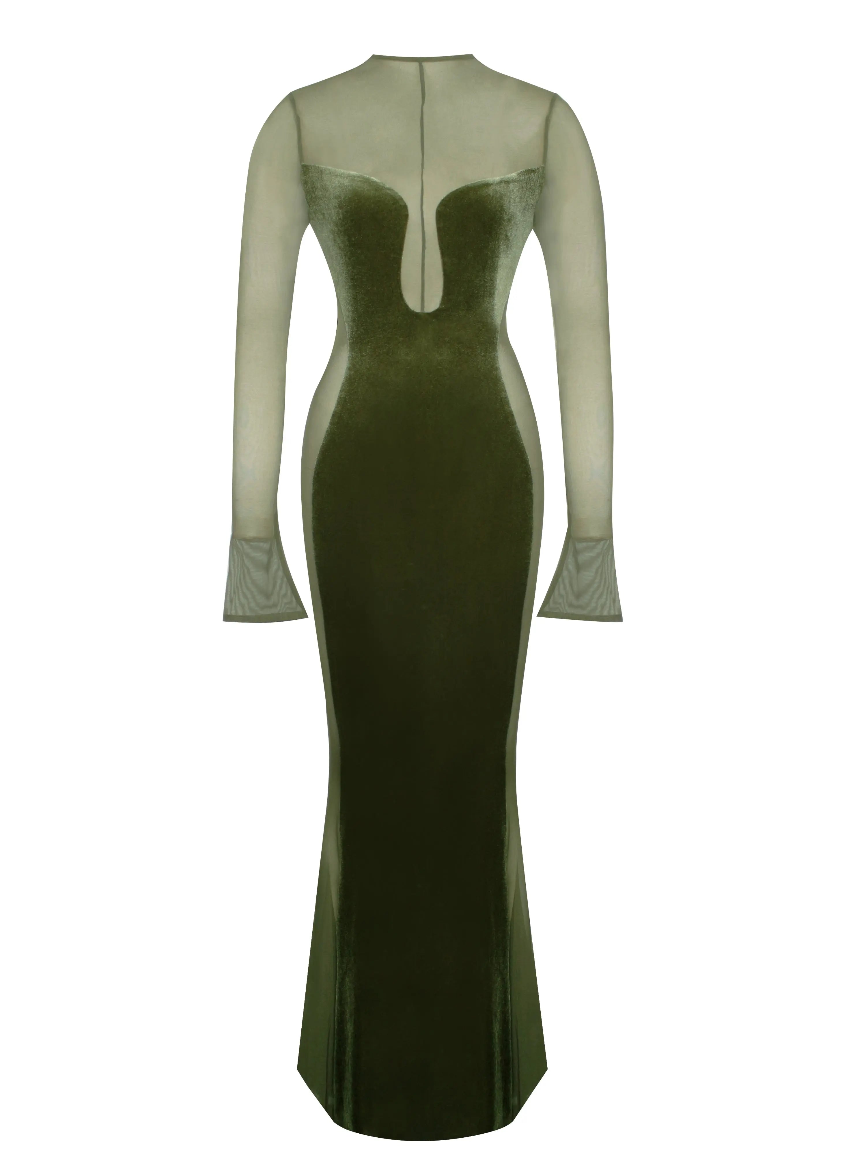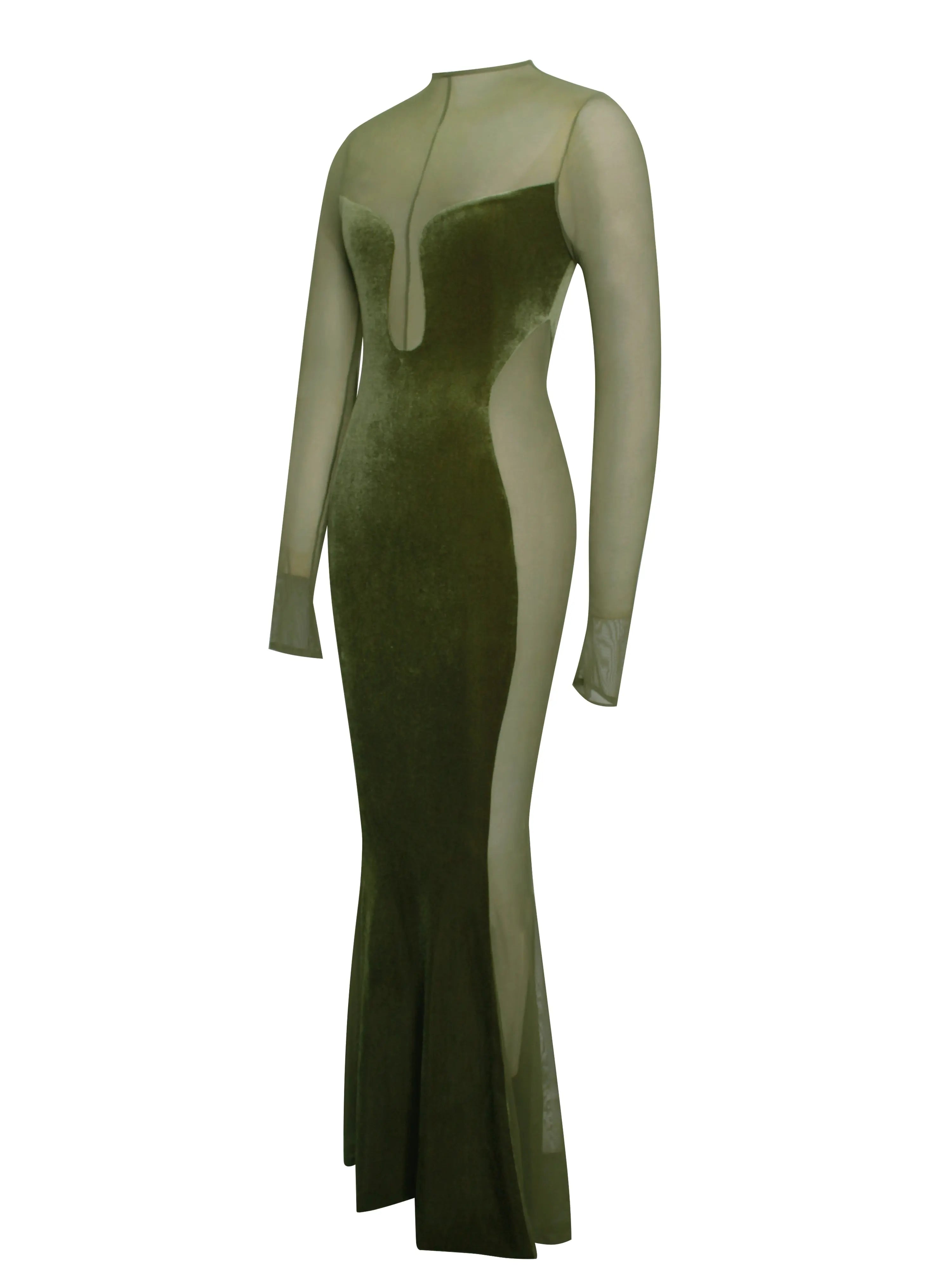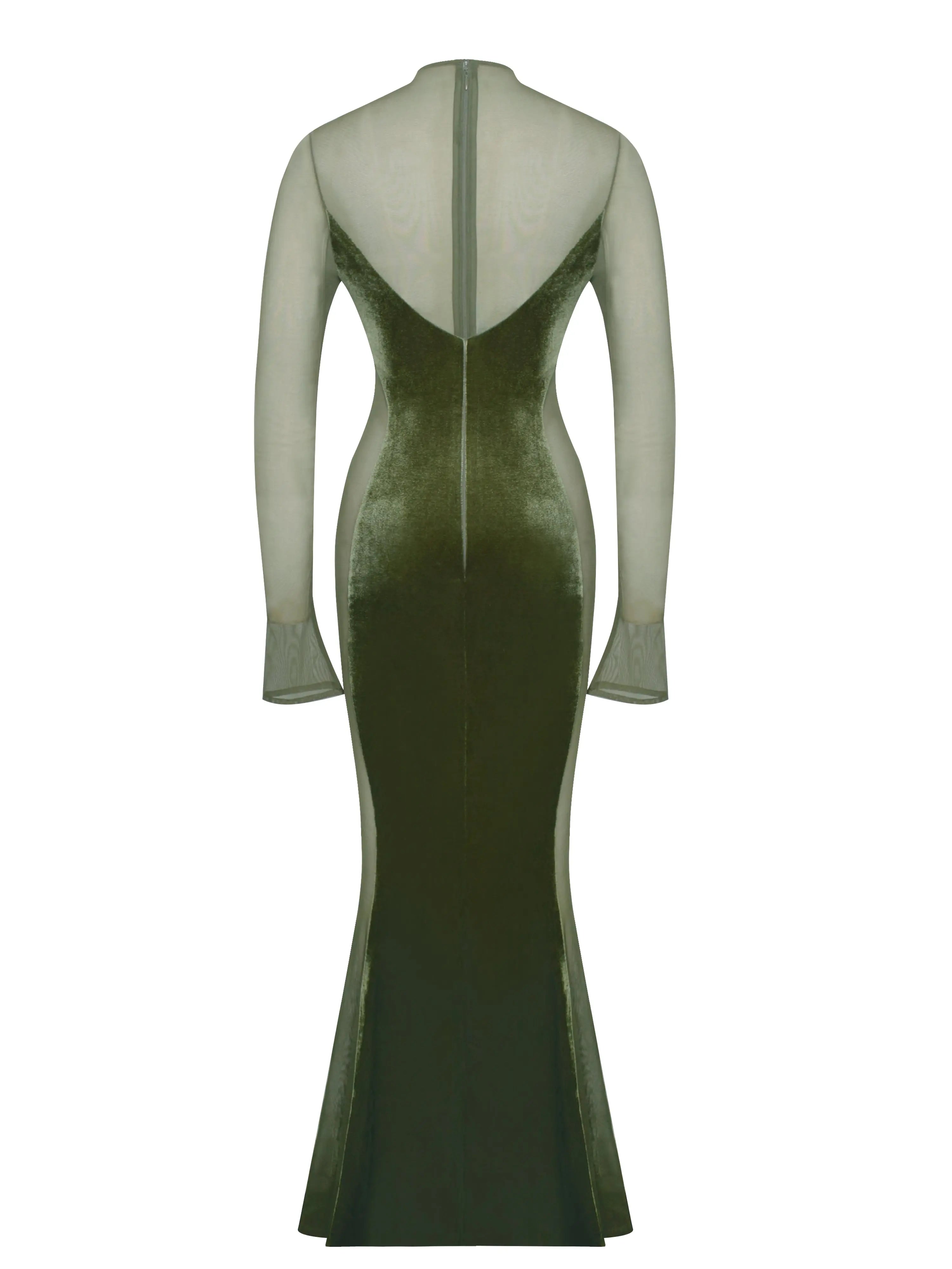 ADDISYN OLIVE GREEN VELVET MESH GOWN