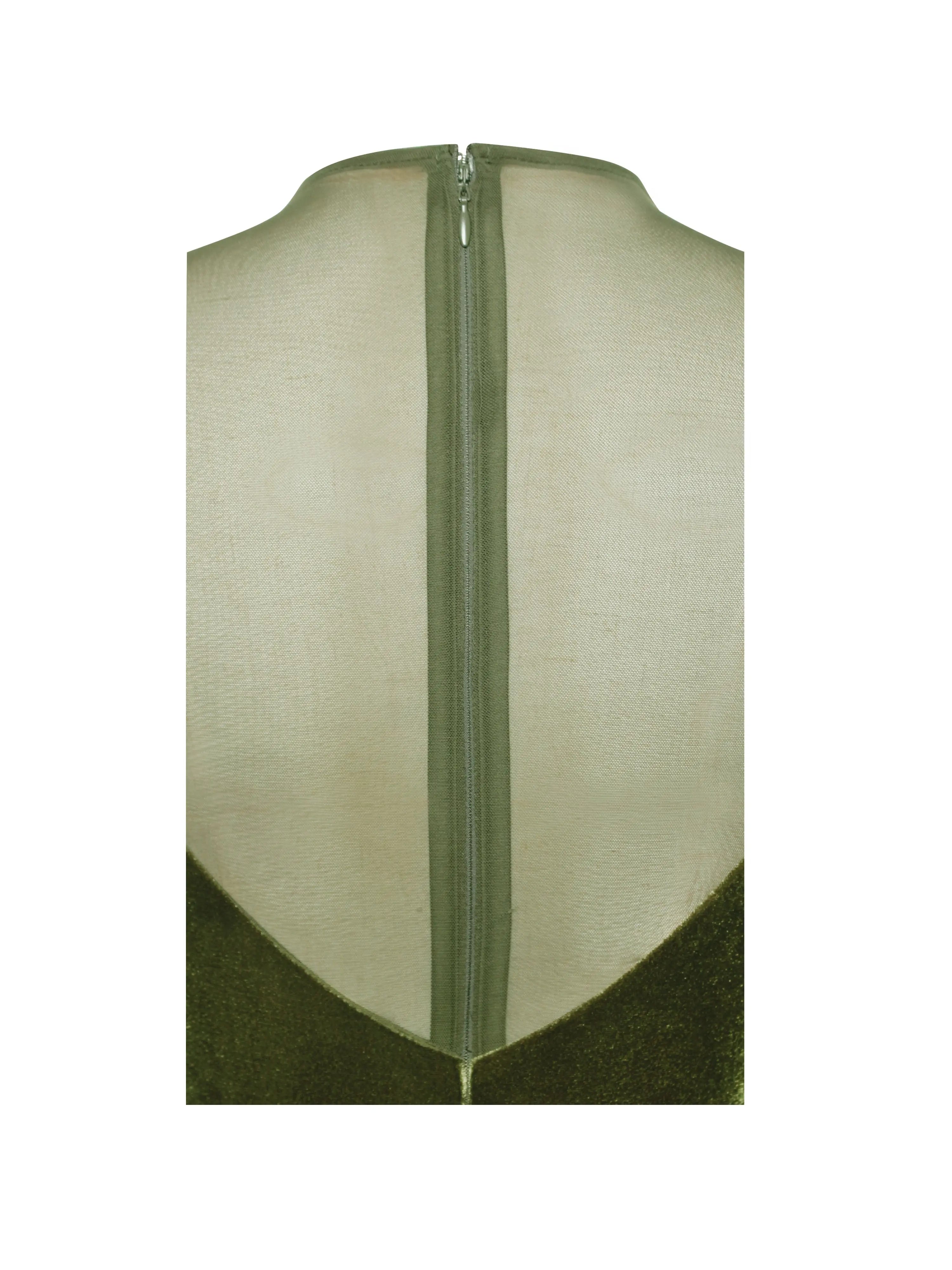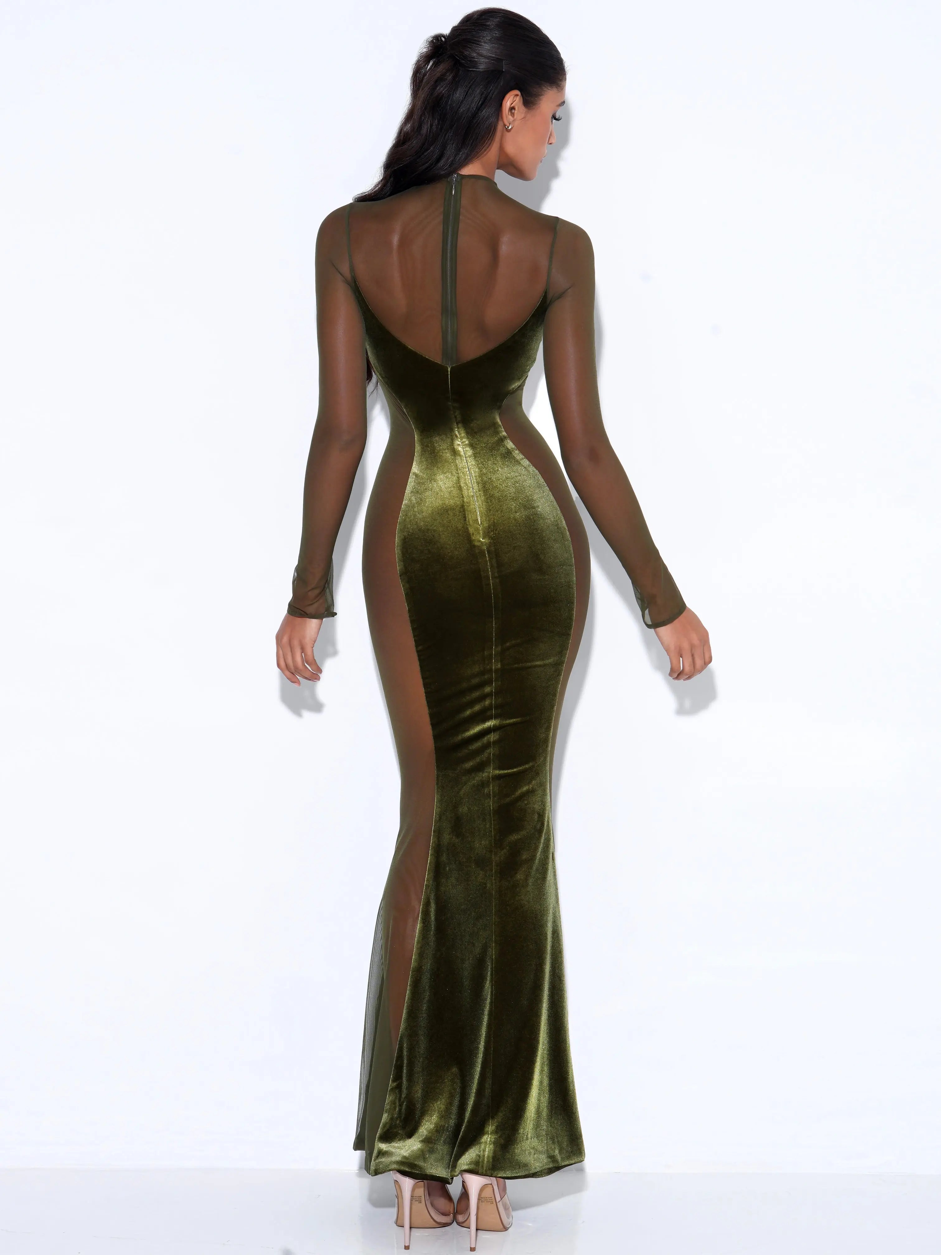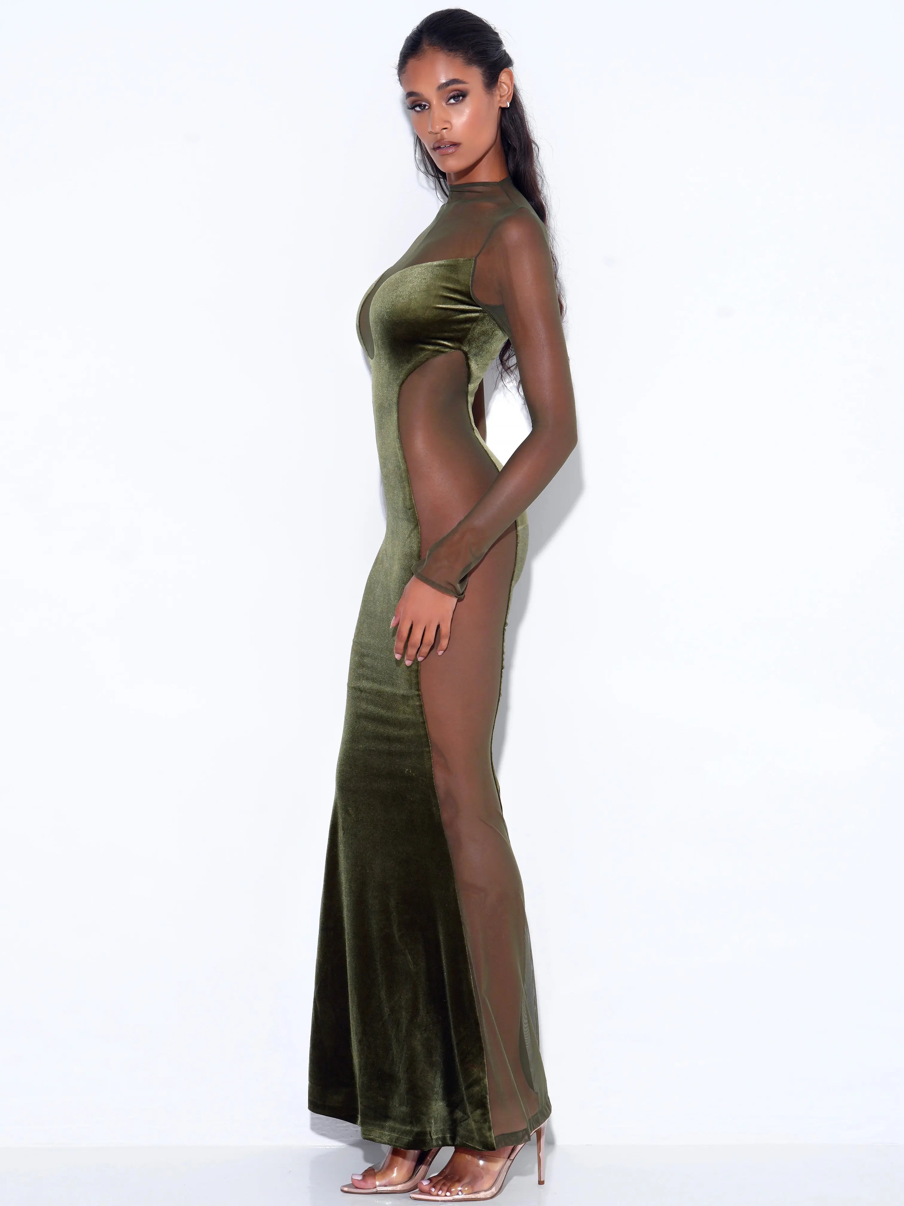 ADDISYN OLIVE GREEN VELVET MESH GOWN