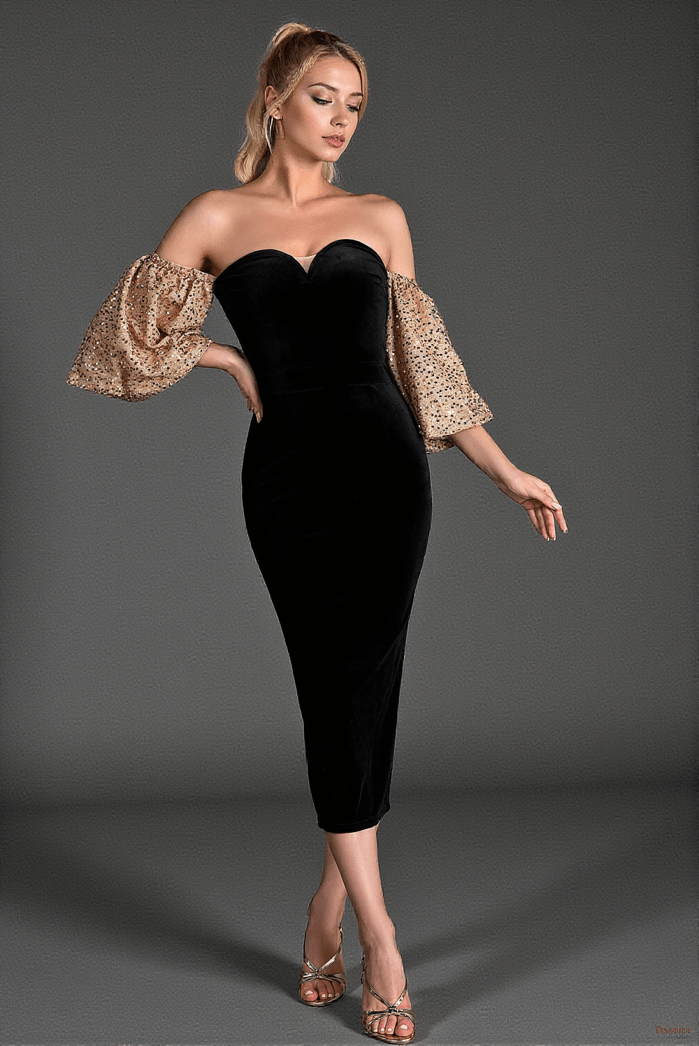 The off-shoulder neckline draws attention to your shoulders and collarbone while the intricate velvet patchwork pattern adds a touch of opulence. The sequin embellishments on the sleeves catch the light beautifully, adding just enough sparkle to complete any ensemble without overpowering it.
