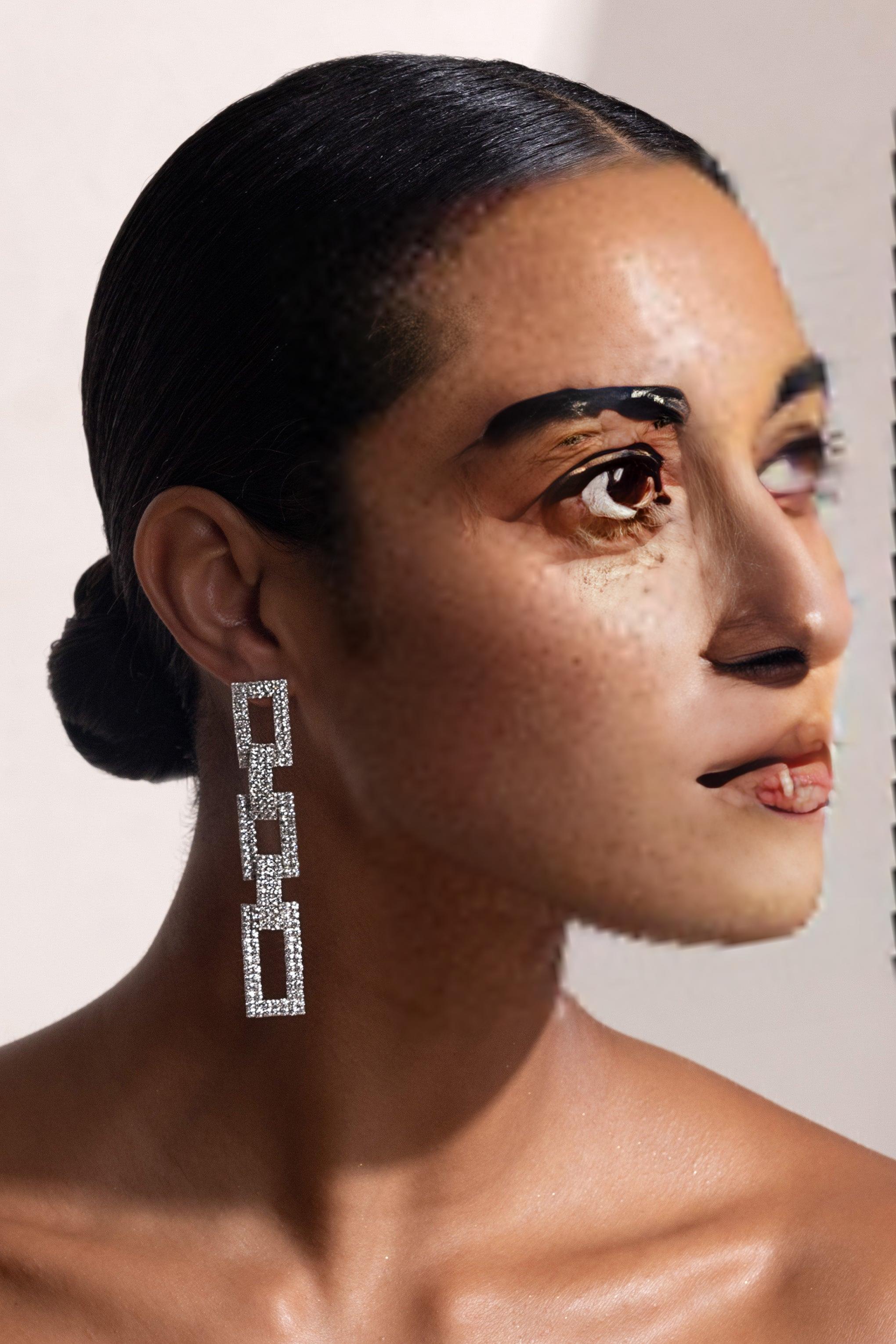 • The earrings feature a squared shape adorned with delicate diamantes, creating a glamorous and eye-catching look.