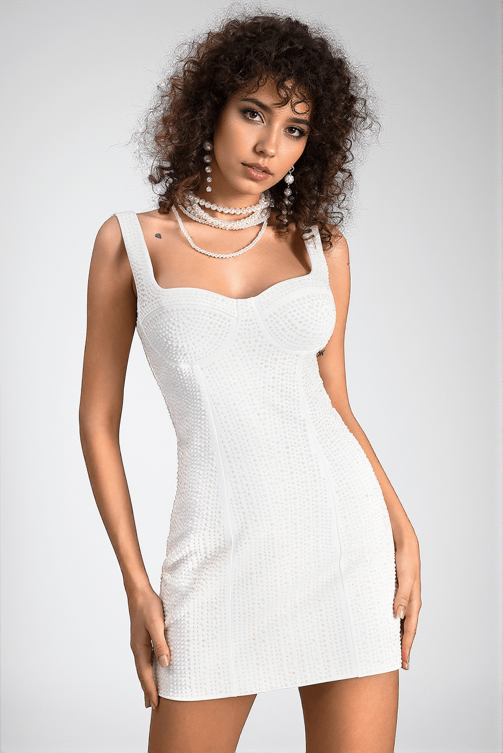 The mini length offers a touch of playful charm, making this dress ideal for any special occasion or evening out. Whether attending an elegant cocktail party or a chic soiree, the Pearl Bead White Mini Dress promises to make a striking statement with its understated glamour.