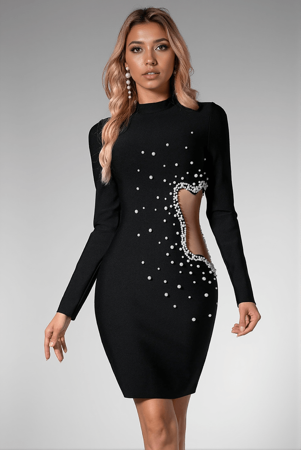 Elevate your evening wardrobe with the Danial Pearl Cutout Bandage Dress. This stunning, long-sleeved number features a body-hugging bandage design and intricate pearl embellishments that add an elegant touch of glamour to any special occasion.