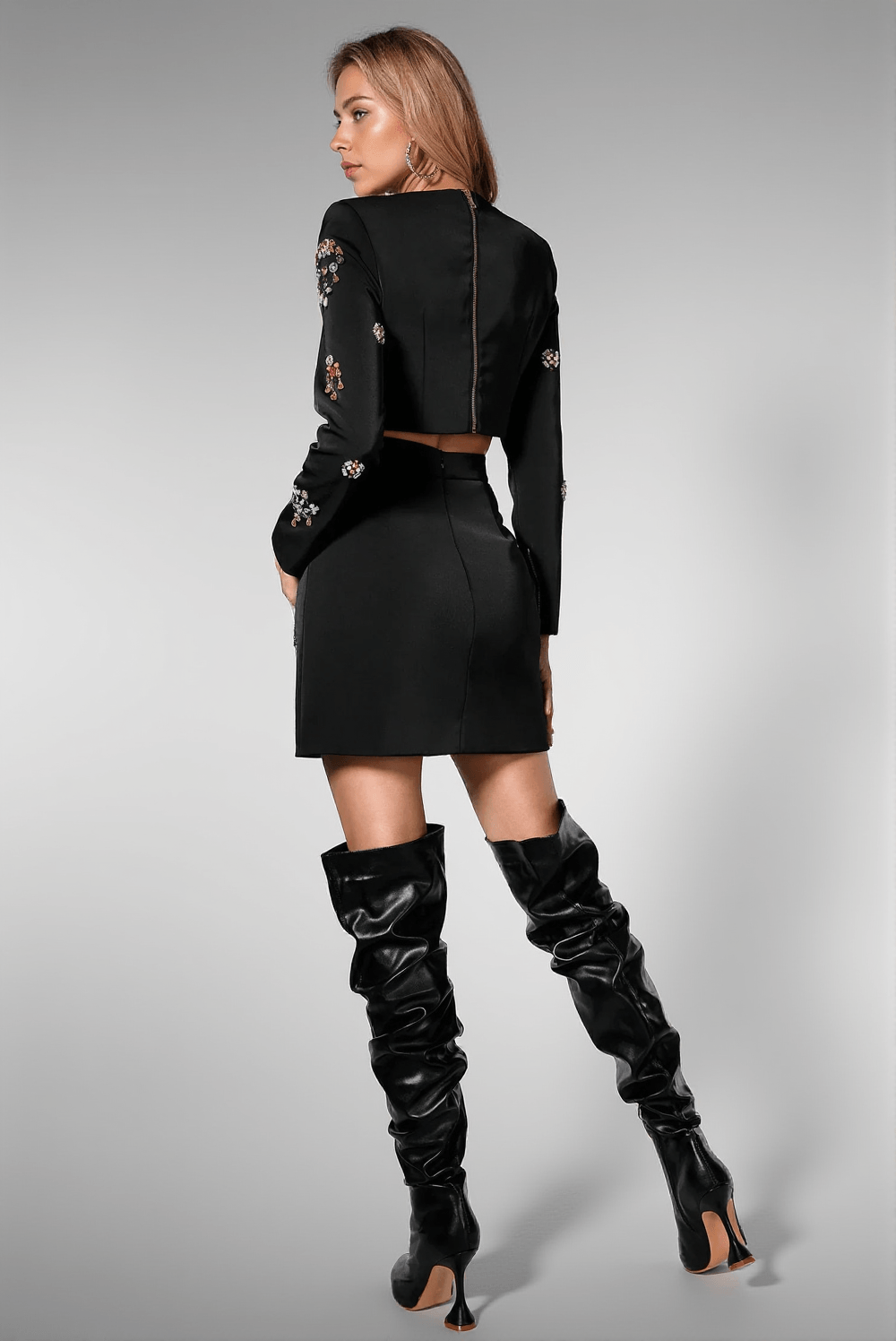 This set is designed for versatility, perfecting your look whether you're attending a red carpet event or a chic evening party. Its luxurious materials ensure it stands out as the focal point of any occasion.