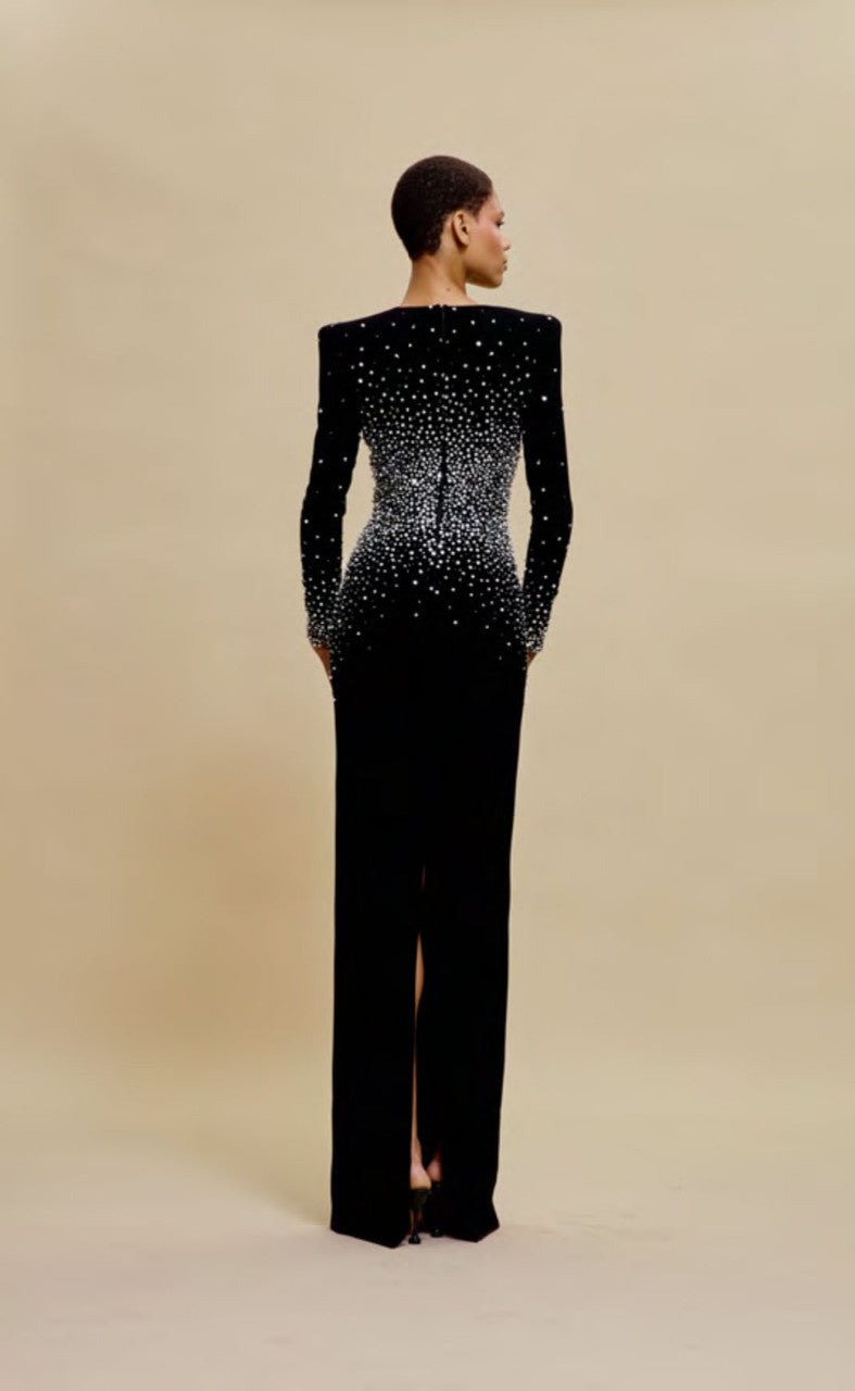 Elevate your style with our pearl embellished v-neck maxi dress in classic black. The intricate pearl details add a touch of elegance, while the v-neckline elongates your silhouette. Perfect for any special occasion, this dress will make you look and feel like a fashion expert.
