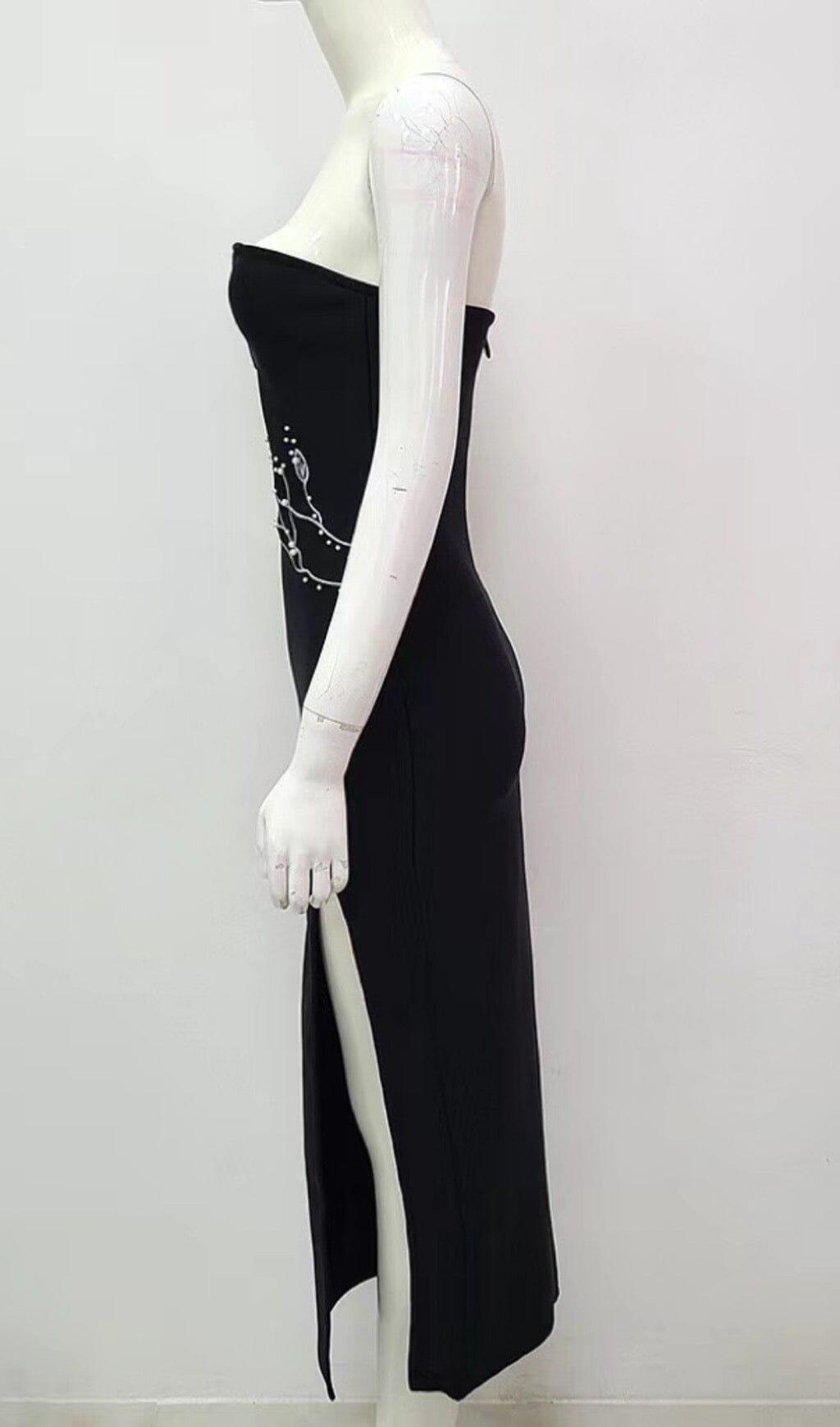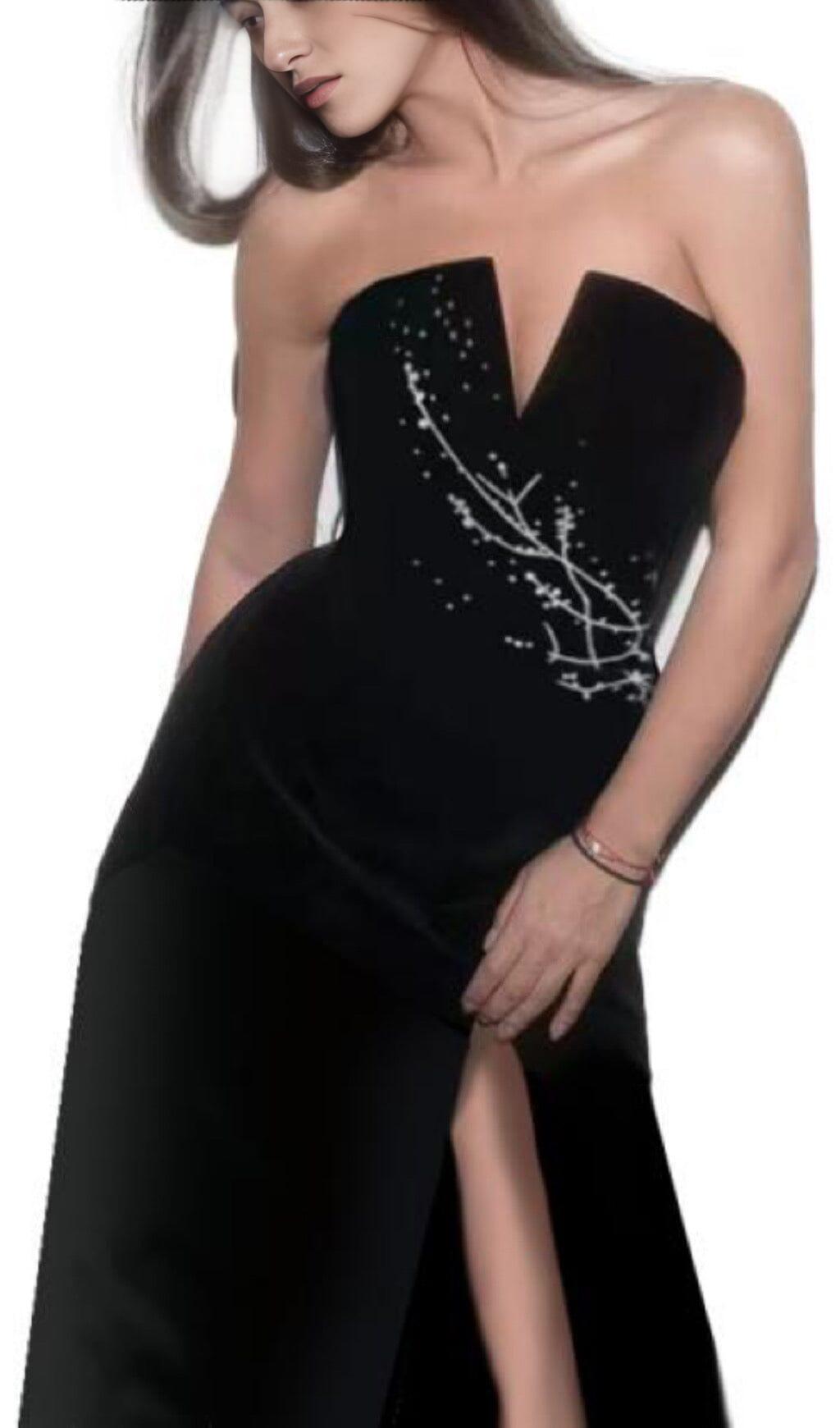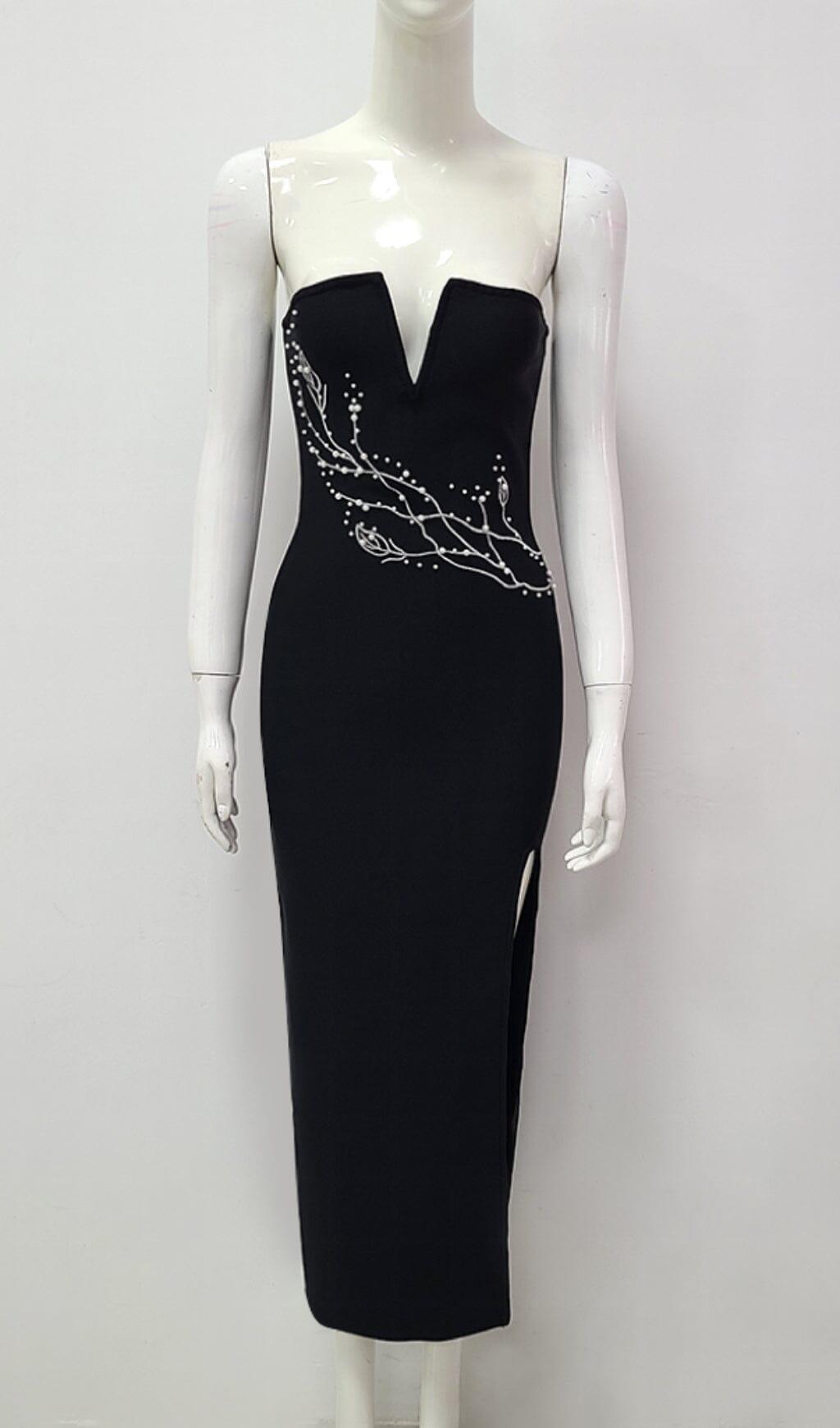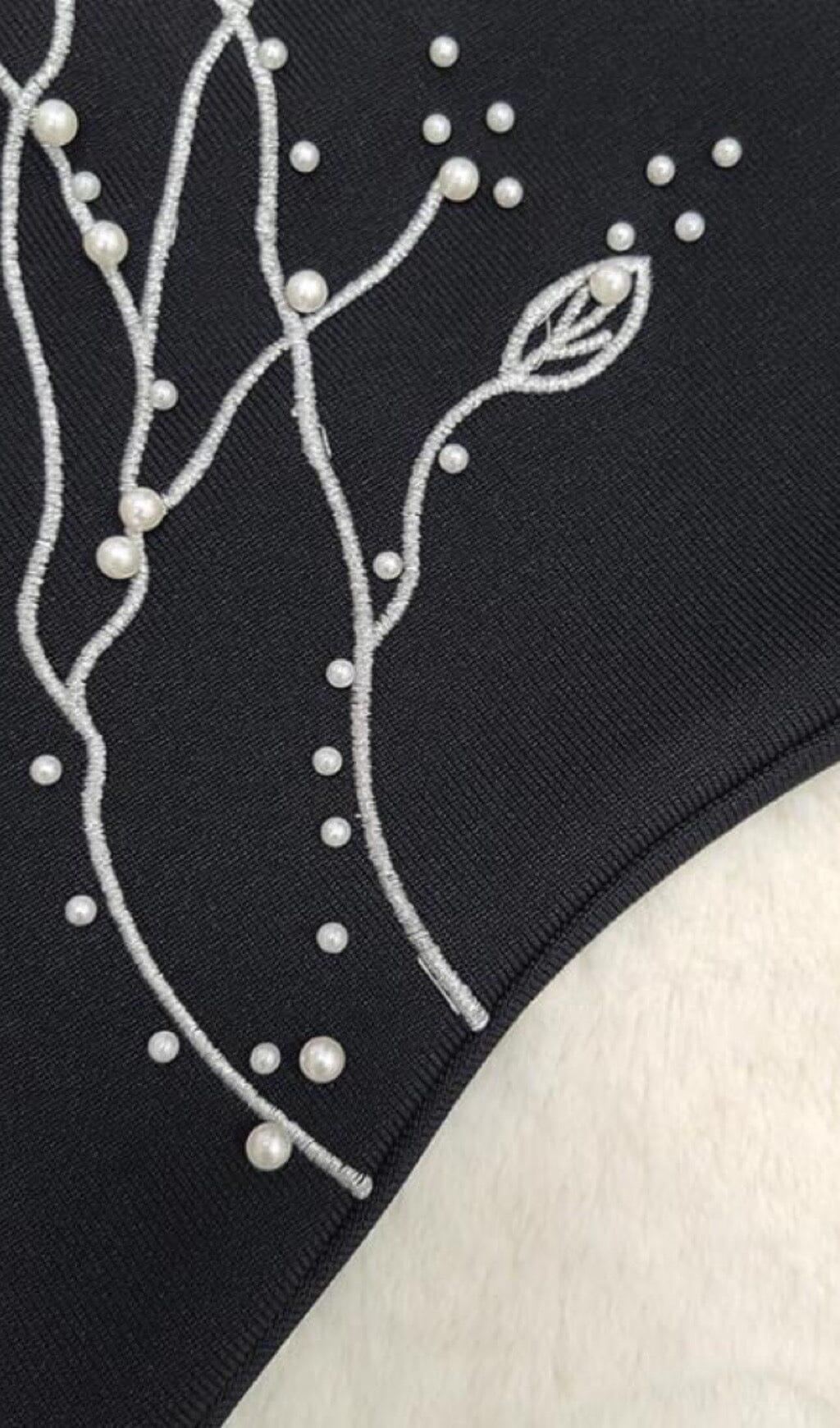 Introducing our Pearl Skinny Midi Dress in Black, a truly dignified and elegant dress that exudes sophistication. This dress features a deep V chest design, adding a touch of allure to the classic black dress. The waist is adorned with beautifully embroidered pearls, creating a stunning and realistic design. With its tasteful and refined aesthetic, this dress is a must-have for any stylish woman.