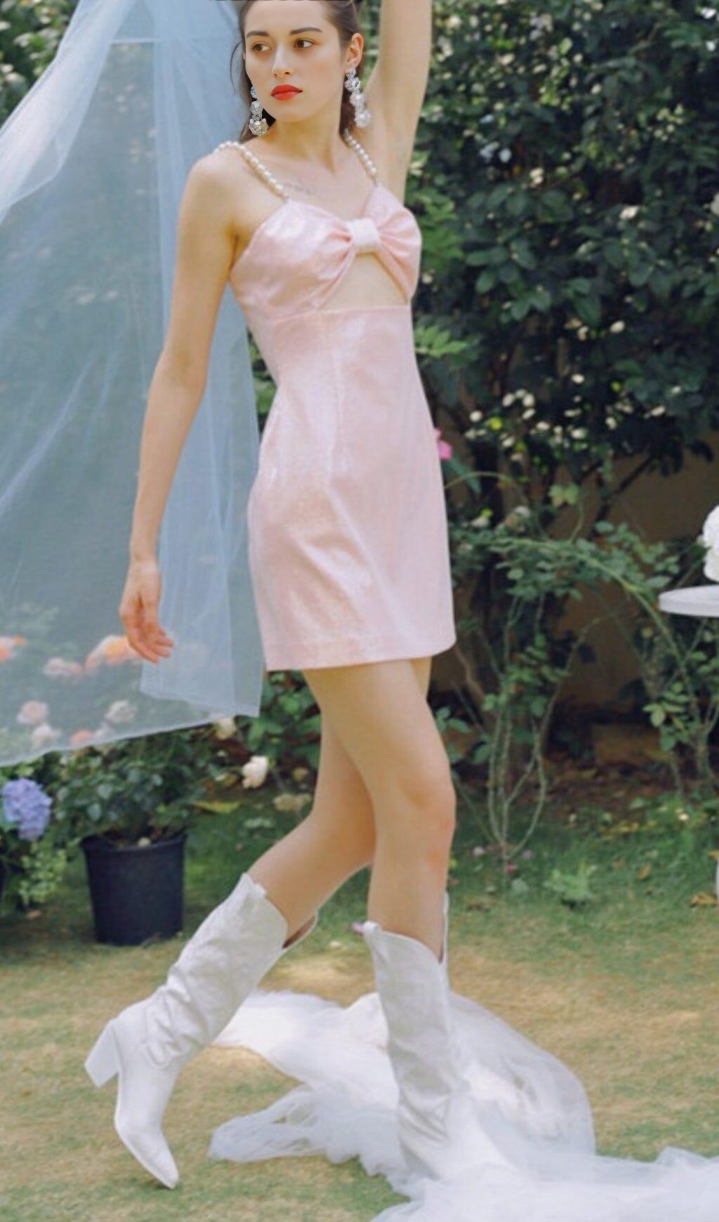 PEARL STRAPPY SATIN MINI DRESS IN PINK