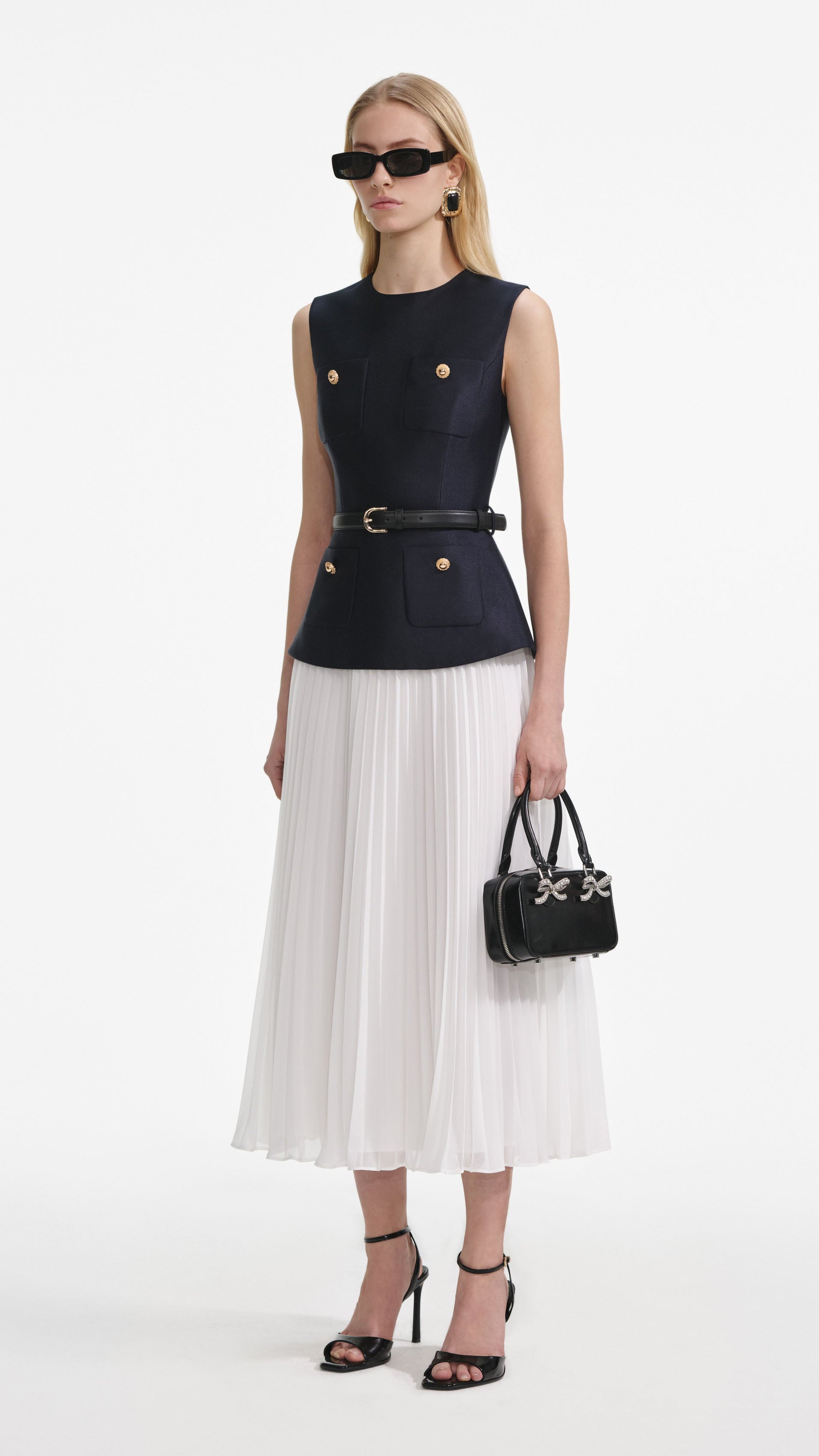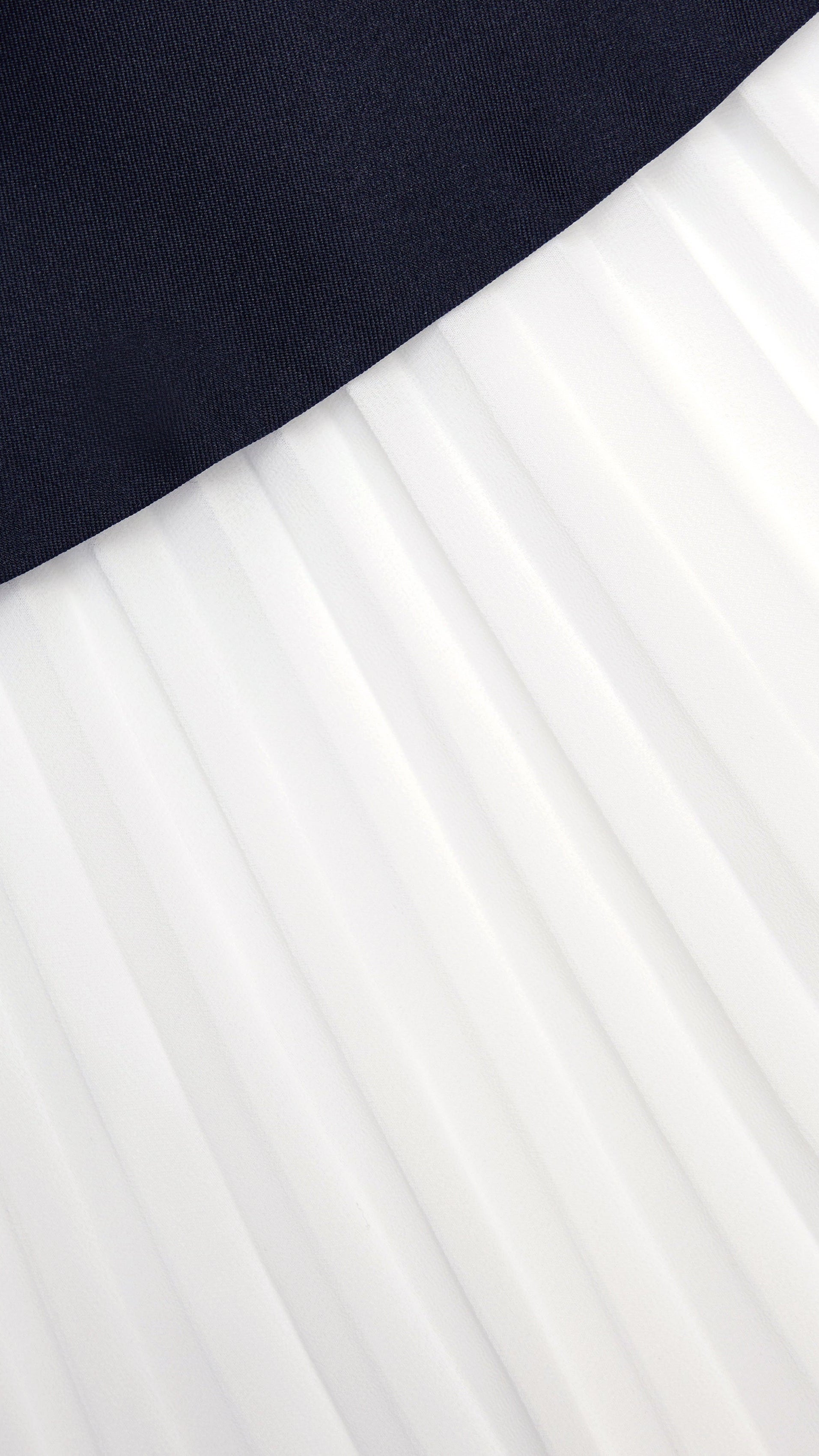 Structured navy taffeta and dreamy white chiffon meet to perfection in this tailored midi dress. A belted waist and gold buttons add ladylike details – pair with heels for timeless elegance.