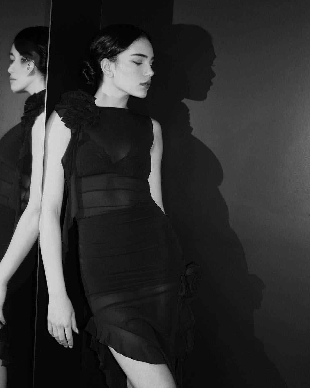 What sets this dress apart from others is the unique design element of a sheer panel across the chest and shoulders. This adds a daring and contemporary twist to the classic midi dress, making it a standout piece for any occasion.