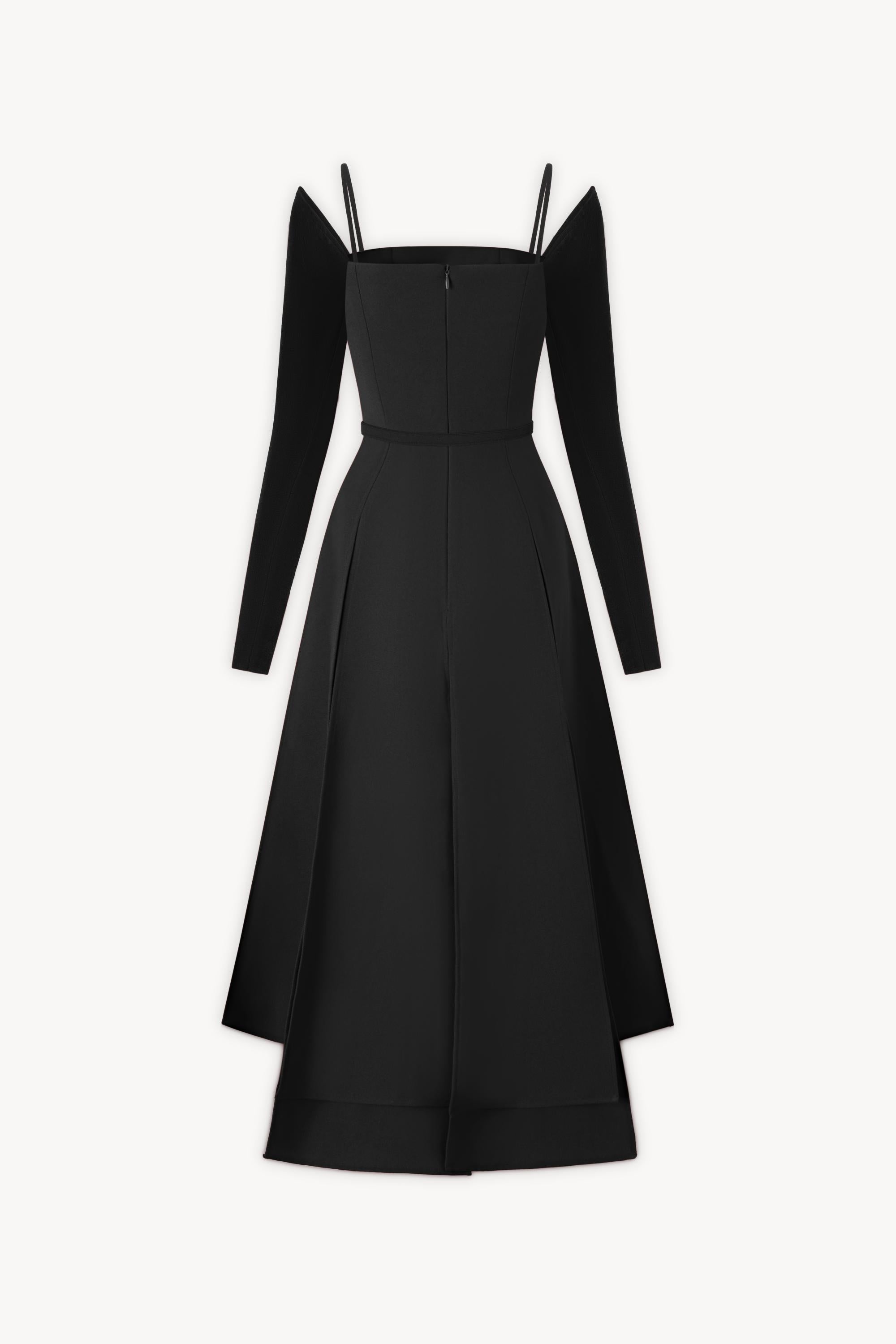 This piece features a double fringed skirt with a flowy length, falls elegantly over the figure. This style is balanced by stretch long sleeves, giving a powerful yet romantic look.