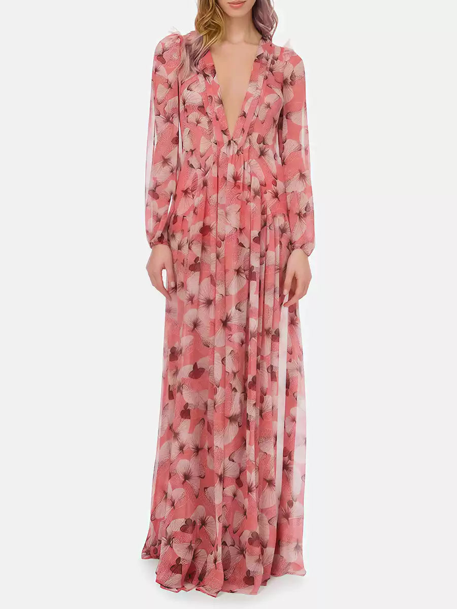 This dress features a pink floral print on sheer chiffon, a deep V - neckline, and long billowy sleeves. The flowing maxi skirt creates an elegant silhouette. Perfect for ��holiday break dress to impress�� moments, a ��beach pictures dress�� outing, or a romantic dinner. Its bohemian - inspired design and alluring neckline let you ��dress to impress�� with a feminine, summery charm, ideal for outdoor events or vacations where you want to stand out.