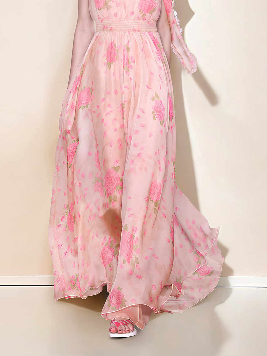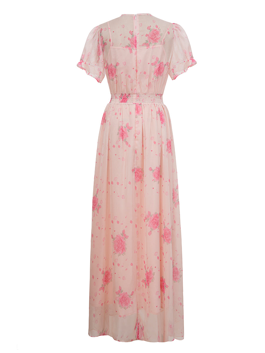 Pink Floral Chiffon Maxi Dress with Bow Neckline