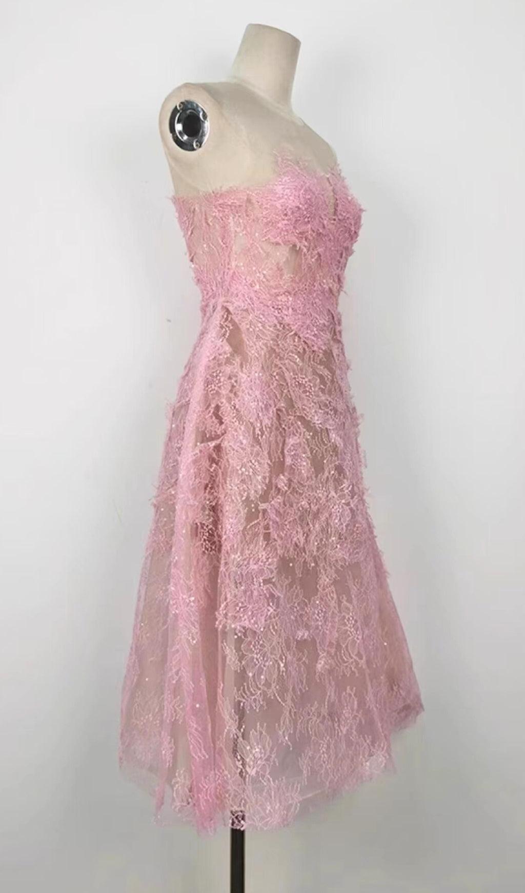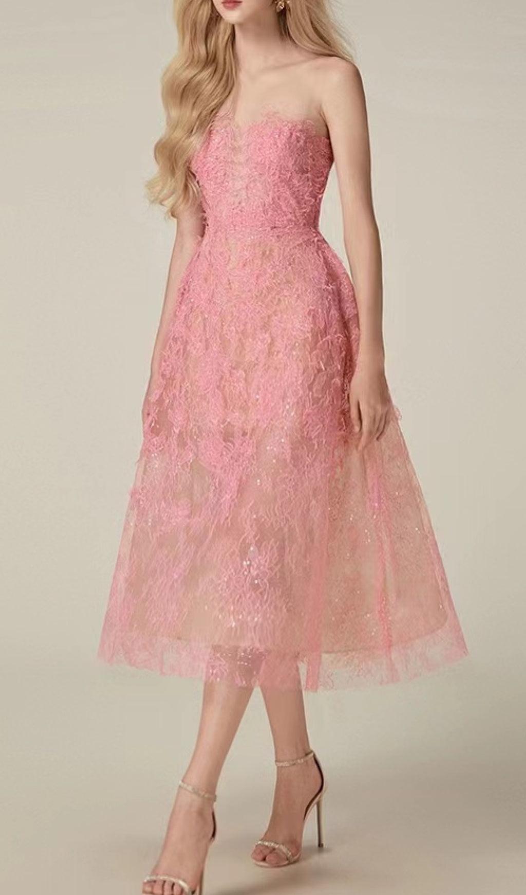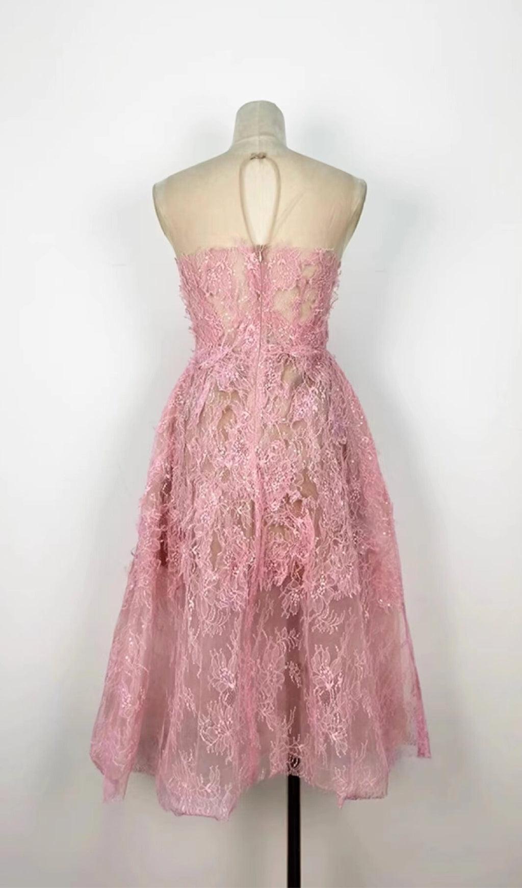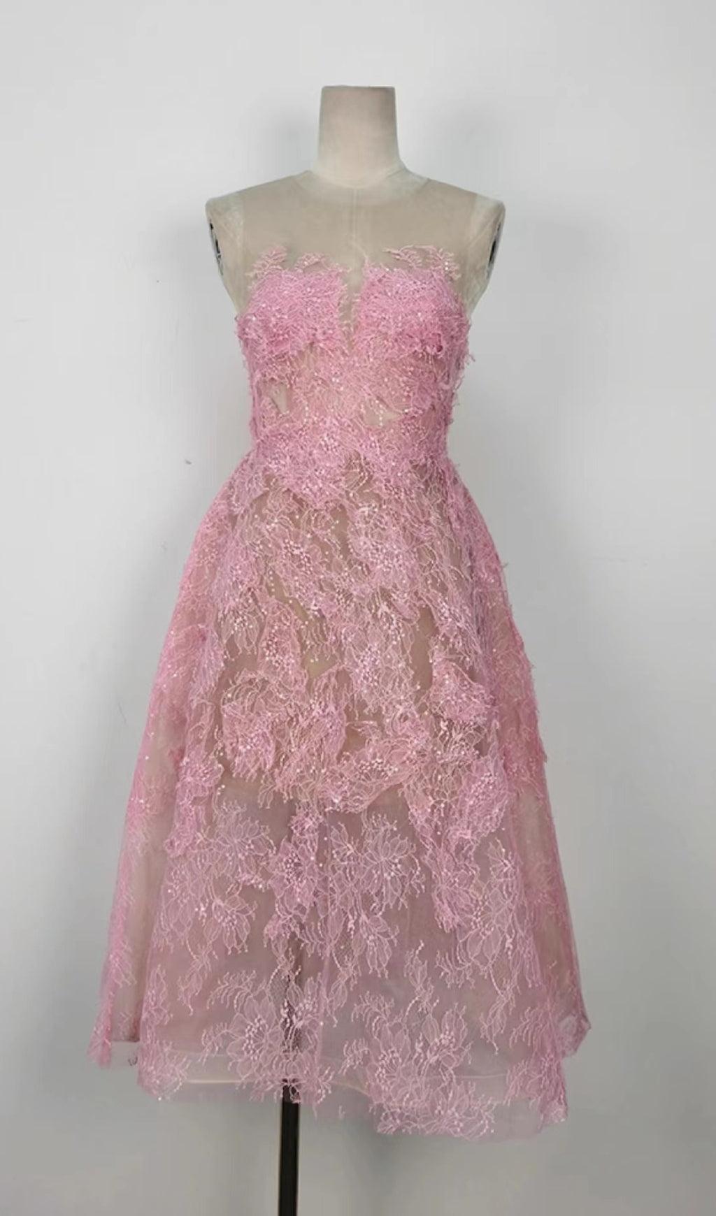 PINK FLORAL LACE EMBROIDER MIDI DRESS