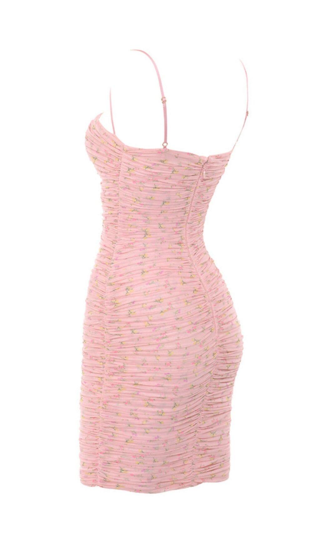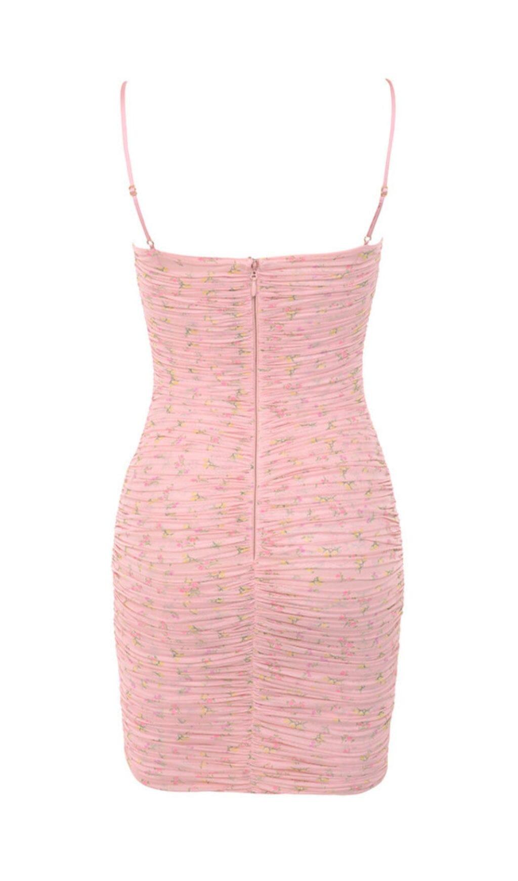 PINK FLORAL RUCHED ORGANZA MESH MINI DRESS