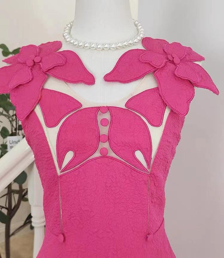 This dress is beautifully designed and has a romantic vacation vibe. The jacquard design and the tight waist are quite unexpected, and we love the beautiful three-dimensional flower relief. It has a zipper to the back for convenience.
