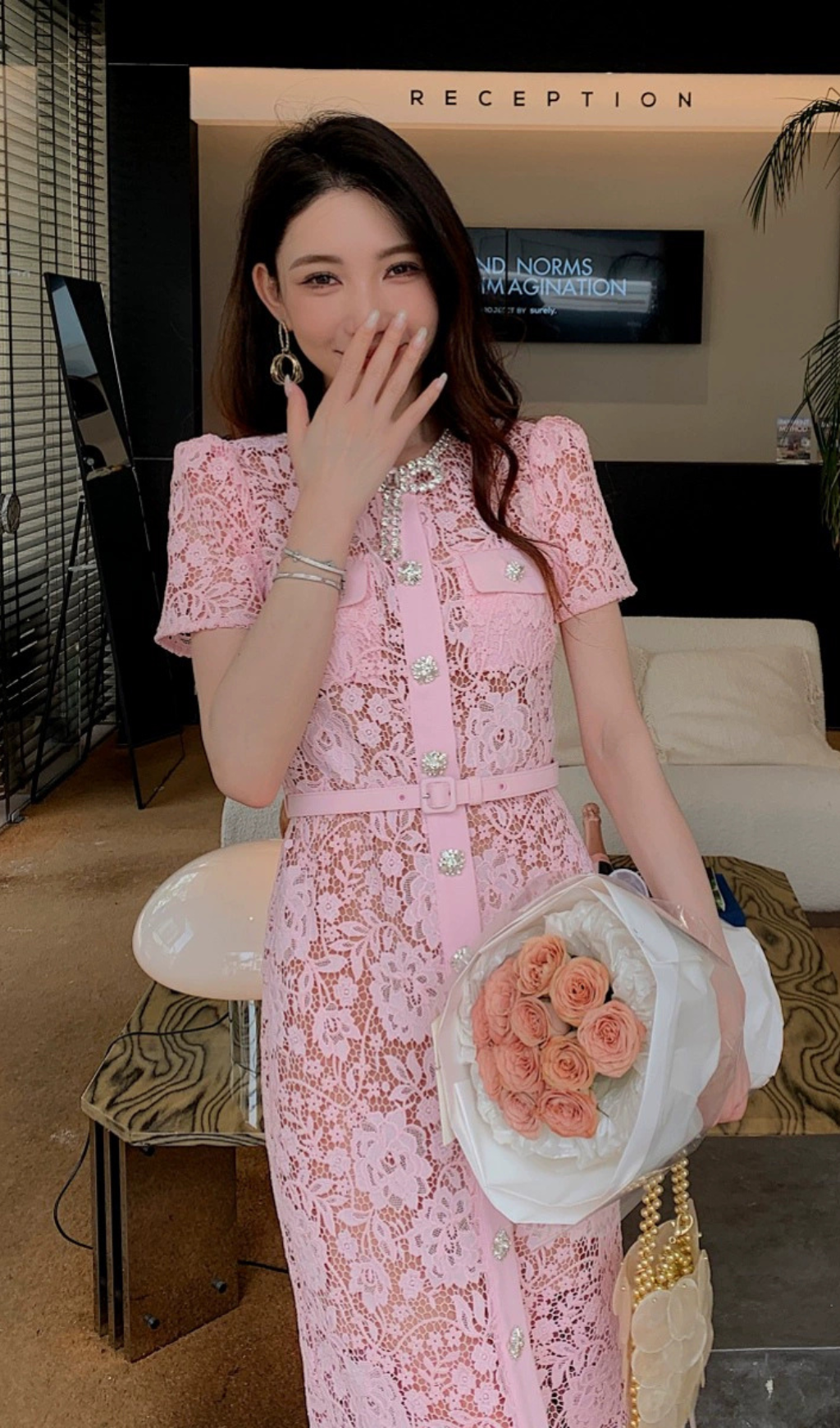 A romantic vision in pink lace, this dress puts its rich textures on show with a universally flattering silhouette. Echo its diamanté bow and trims with sparkling accessories at the next soirée.
