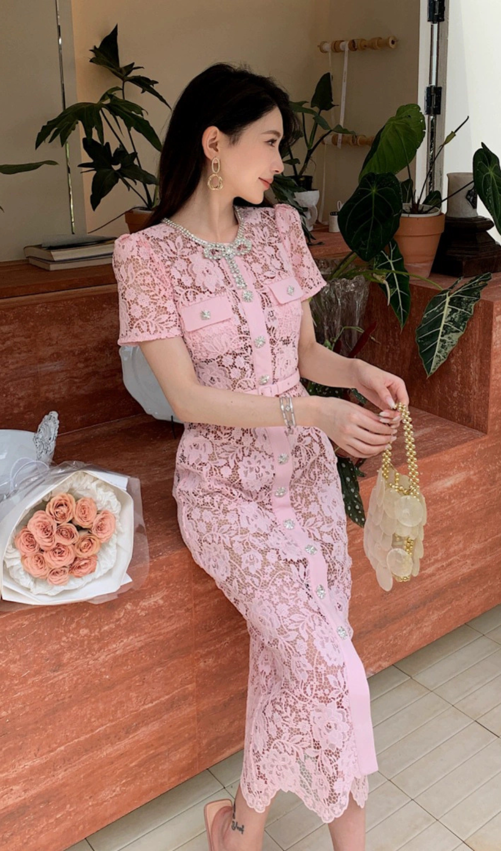 PINK LACE DIAMANTE BOW MIDI DRESS