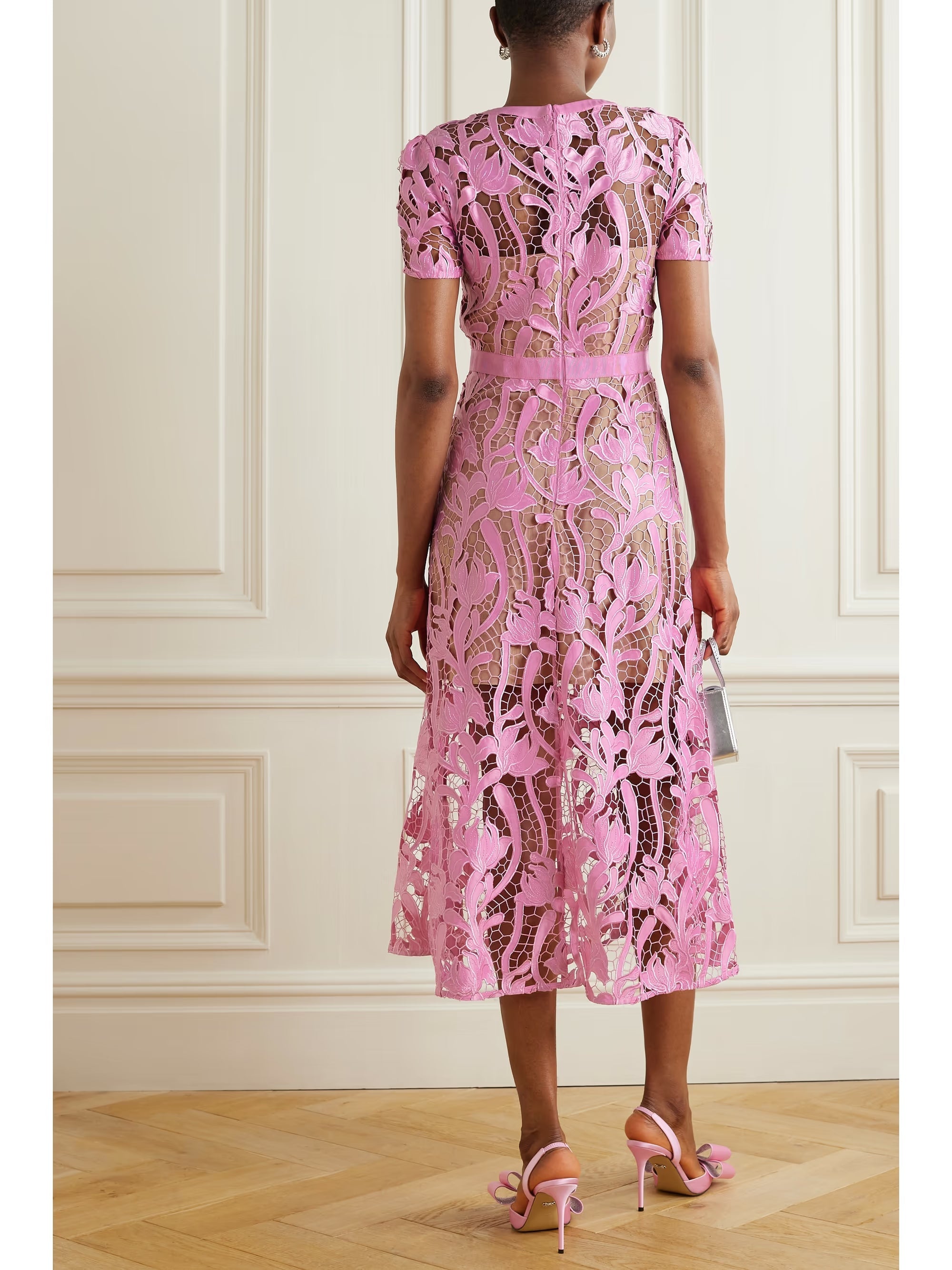 Featuring delicate pink lace, this midi dress adds a touch of romance to any occasion. With a flattering midi length, it's perfect for showing off your legs while still being comfortable. Embrace your inner girly-girl with this dress!"