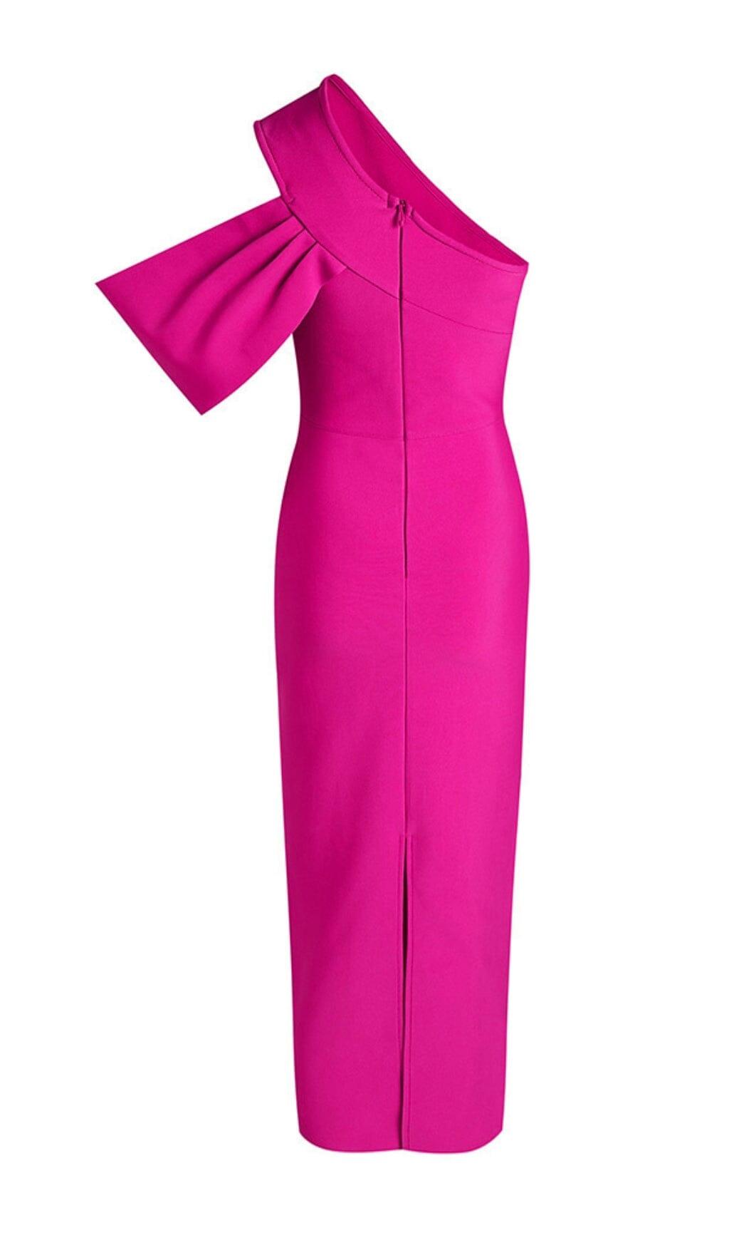 A striking one-shoulder dress, designed with an asymmetrical hemline and exquisitely crafted with a pink hue for a bold look. Feel confident and look beautiful in this unique style!