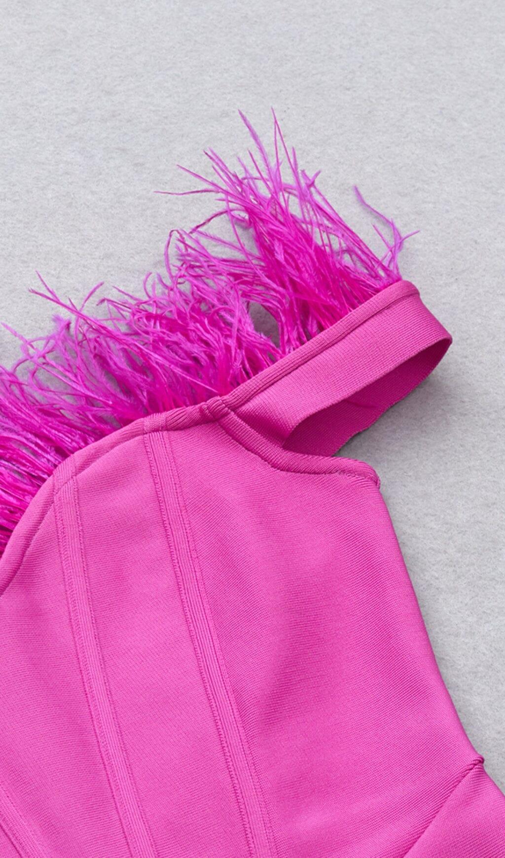 PINK OSTRICH HAIR SHOULDER BODYCON DRESS