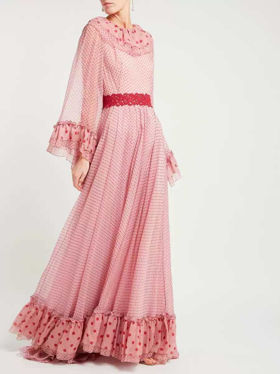 Pink Polka Dot Maxi Dress with Ruffles and Red Belt