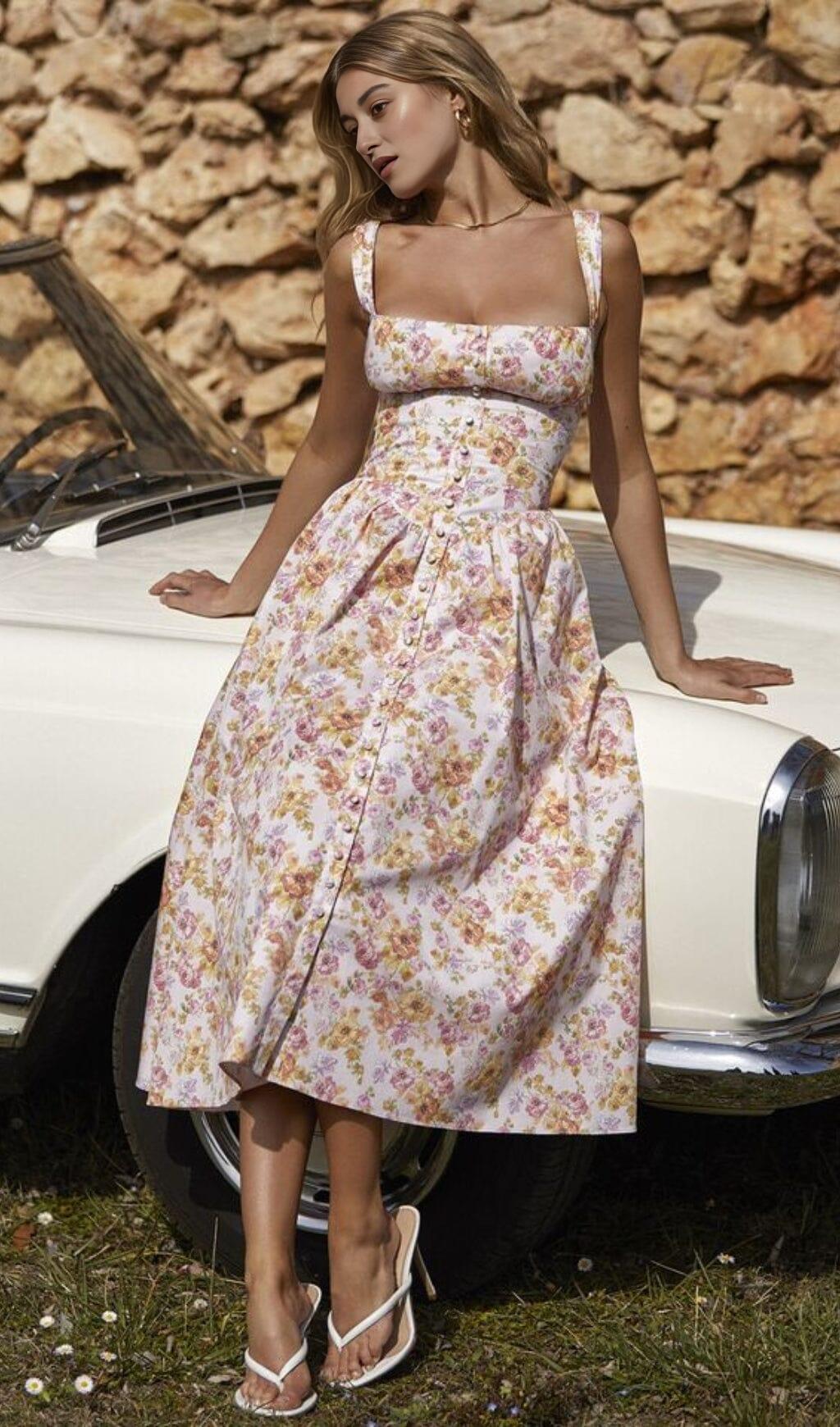 We're loving how the floral prints stand out this season for their beautiful colours and lifelike details. Decorated with pretty blooms, the PINK PRINT MIDI SUNDRESS has a vintage feel and is beautifully cut from stretch cotton.