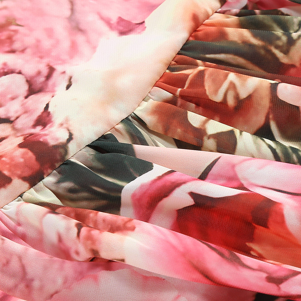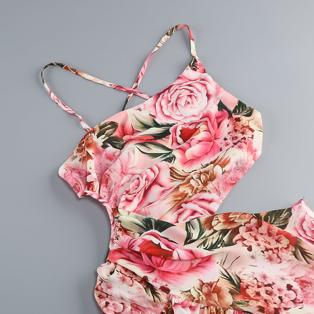 This is a strappy maxi dress. With a vivid magenta base color, it is adorned with colorful botanical prints, creating a strong visual impact. The criss - cross thin straps add a sense of fashion and refinement. The unique cut - out detail at the waist accentuates the waistline, exuding a sexy charm. The skirt is loose with a slit, facilitating movement while adding a flowing feel. Overall, its style is passionate, dynamic, leaning towards a vacation - inspired and trendy fashion vibe.