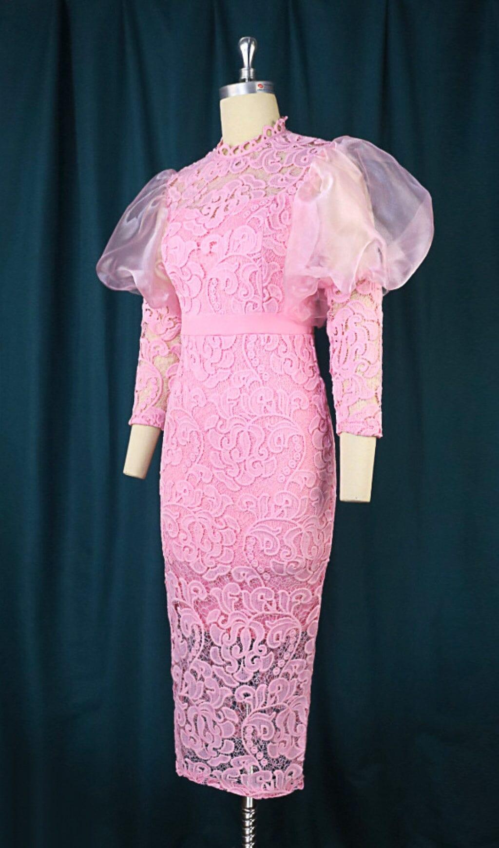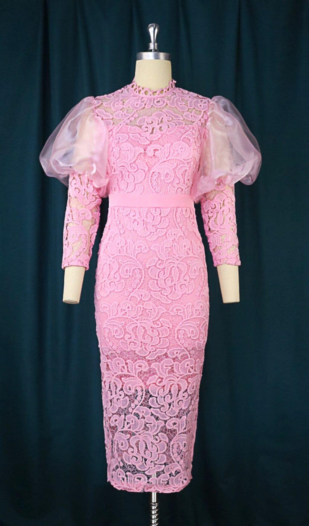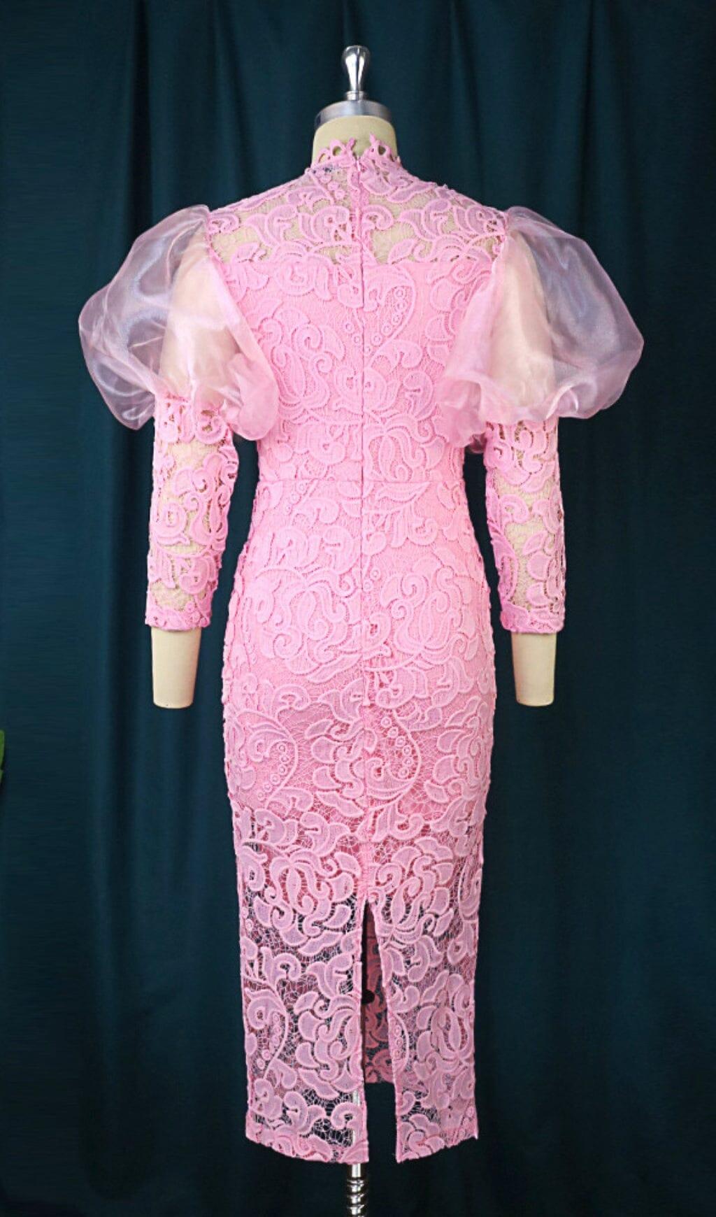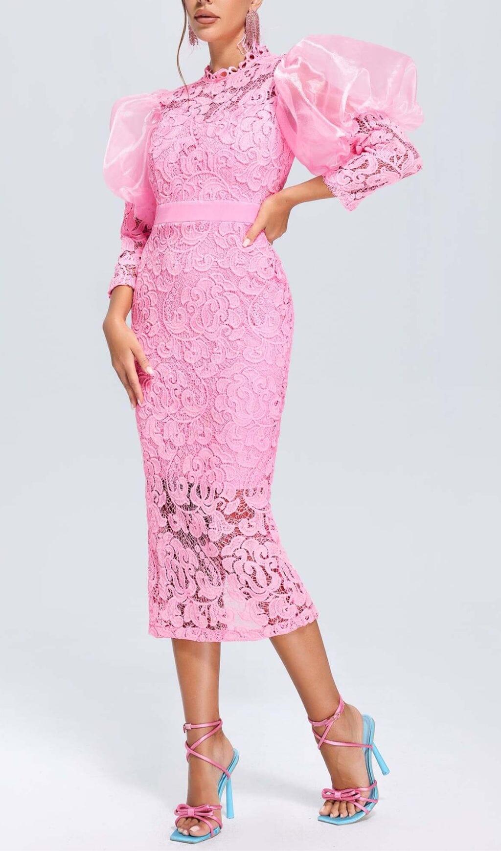 PINK PUFF SLEEVE LACE MIDI DRESS
