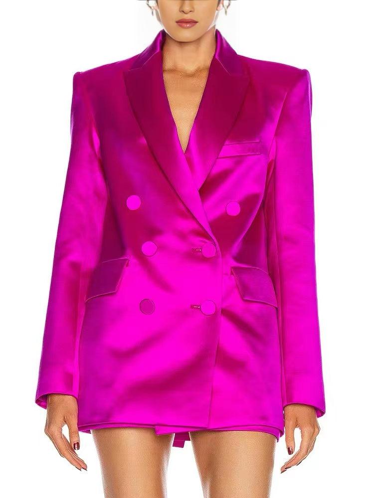 Elevate your style with this stunning Satin Blazer Suit in Pink. Crafted with attention to detail, this blazer suit features a double-breasted design and shoulder pads for a structured and flattering fit. The shiny fabric adds a touch of glamour, making it perfect for those special events.