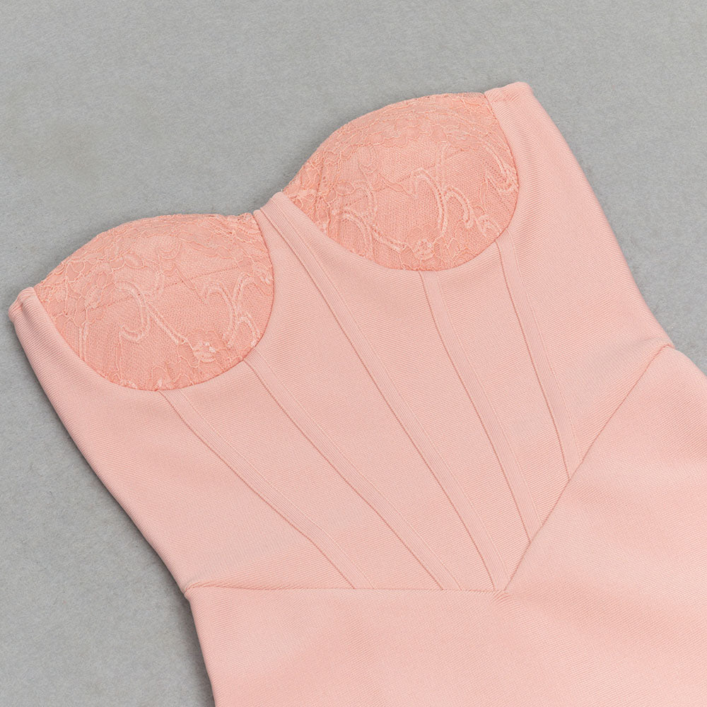 This stunning piece features intricate lace detailing and a flattering corset design, perfect for accentuating your curves. The strapless neckline adds a touch of elegance, making it the perfect choice for any special occasion. Elevate your style with this exclusive and tasteful dress.