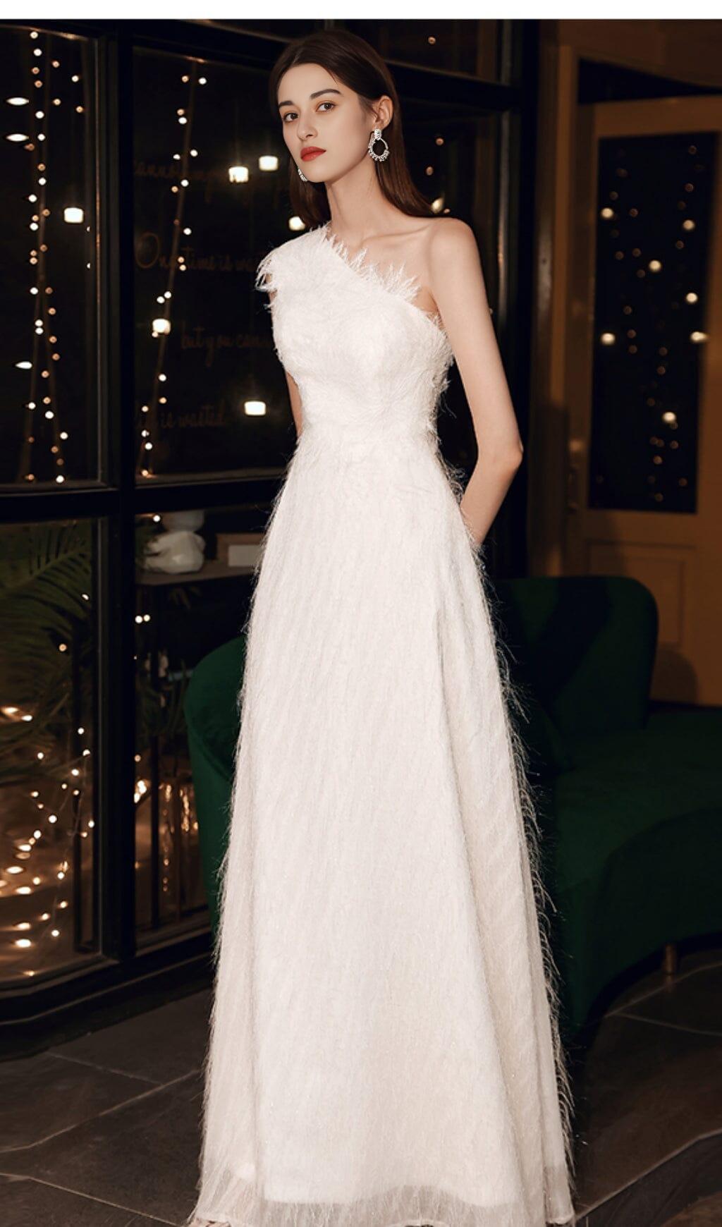 Elevate your style and make a statement with our Plain Cloth Feather One Shoulder Maxi Dress in White. Order yours today and be the center of attention at your next special event.