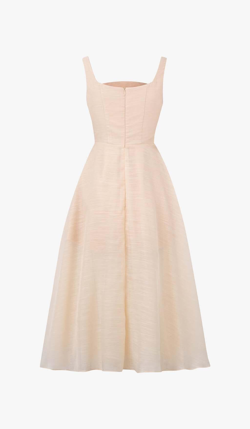 Simple yet stunning, this midi dress is a must-have for your wardrobe. Its slim camisole bodice is designed with delicate pleats that beautifully accentuate your waist. Made in a timeless white color, this dress is perfect for any occasion, whether it's a garden party or a beach wedding.