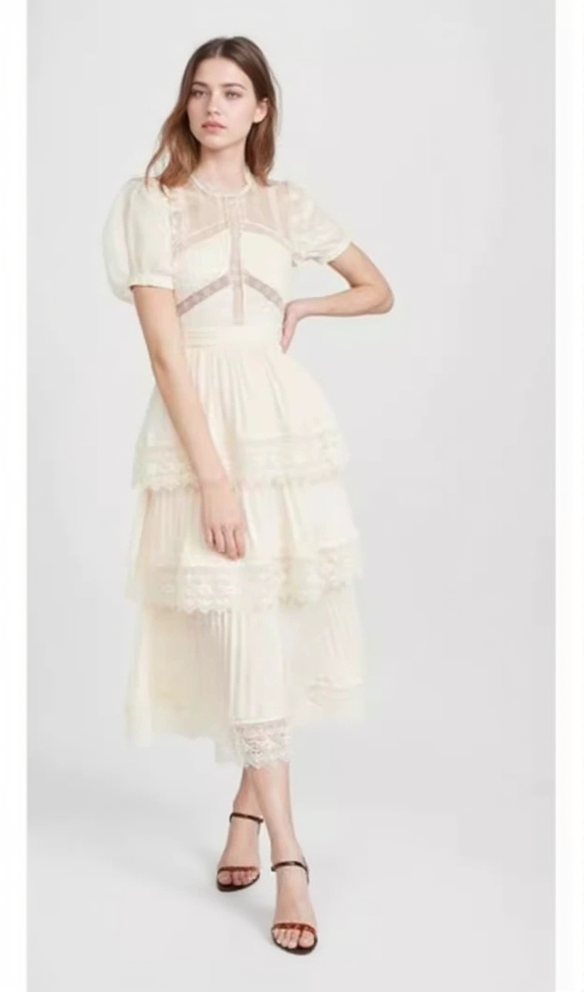The intricate lace details and pleated design make this dress perfect for any occasion. You'll feel confident and elegant in the soft, apricot hue. Available now.