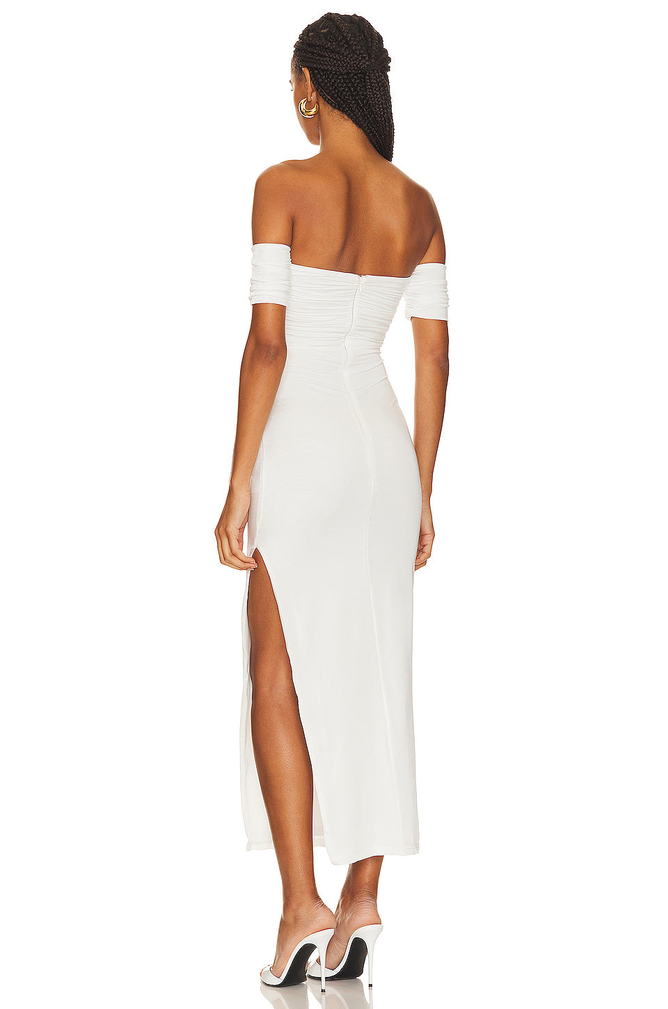 This elegant white midi dress features a pleated design that adds texture and movement, while the off-shoulder neckline highlights the collarbones for a sophisticated look. The subtle cutout detail enhances its modern appeal, making it perfect for formal events or stylish daytime occasions. Crafted to flatter the silhouette, this dress combines classic charm with contemporary style.