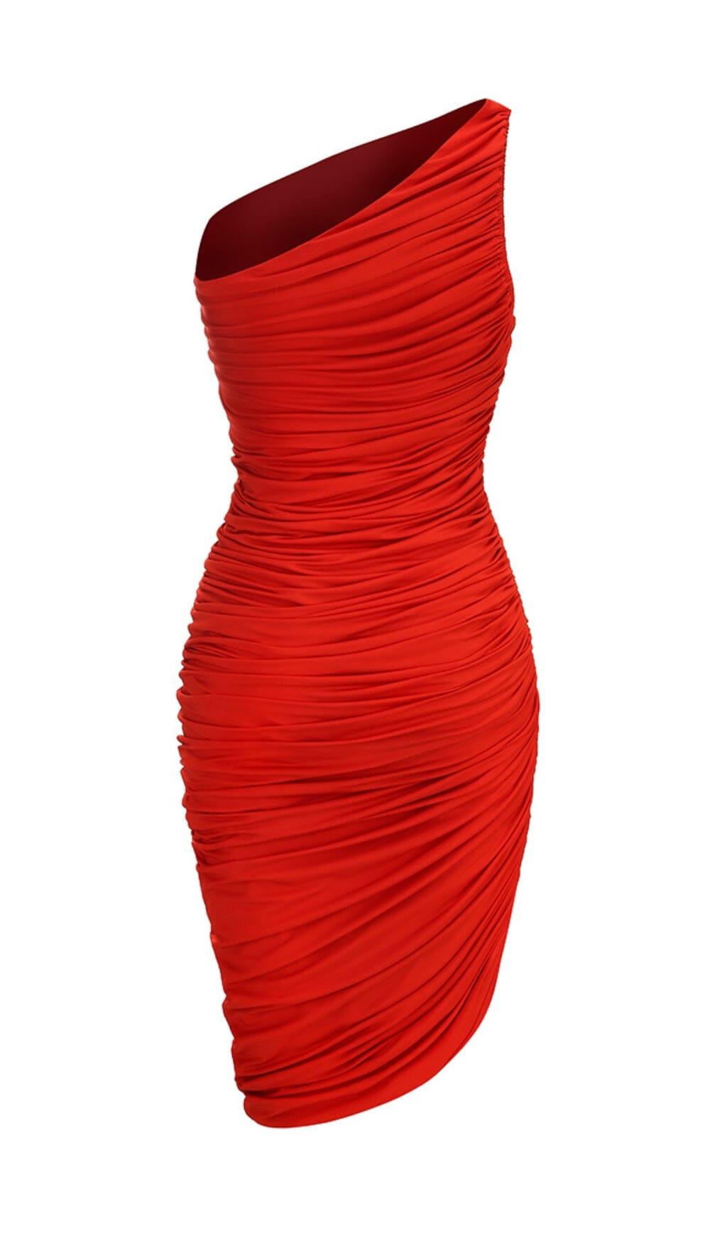 PLEATED SLEEVELESS ONE-SHOULDER DRESS IN RED