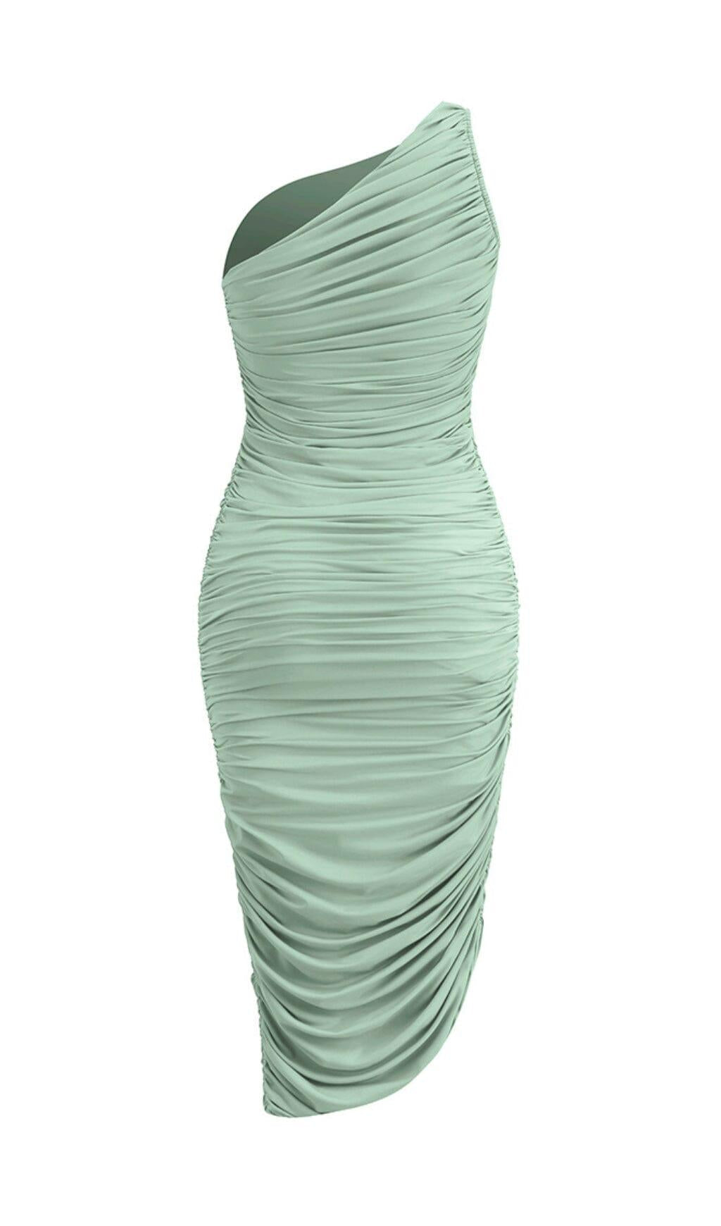 PLEATED SLEEVELESS ONE-SHOULDER DRESS IN GREEN