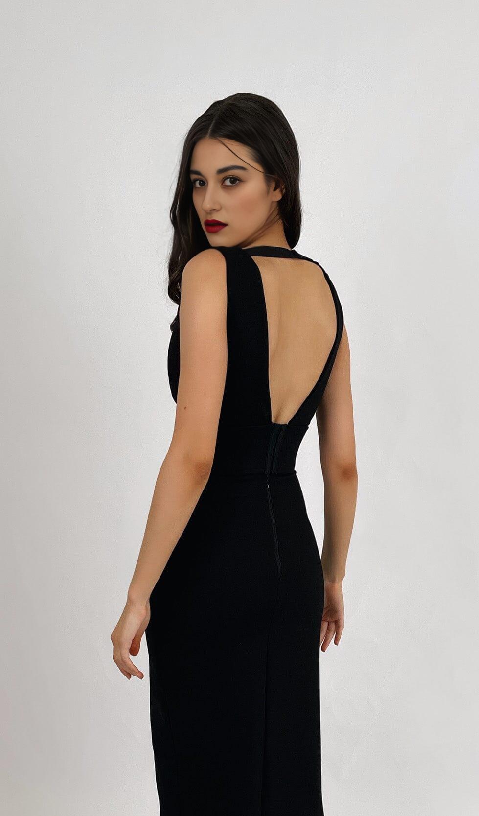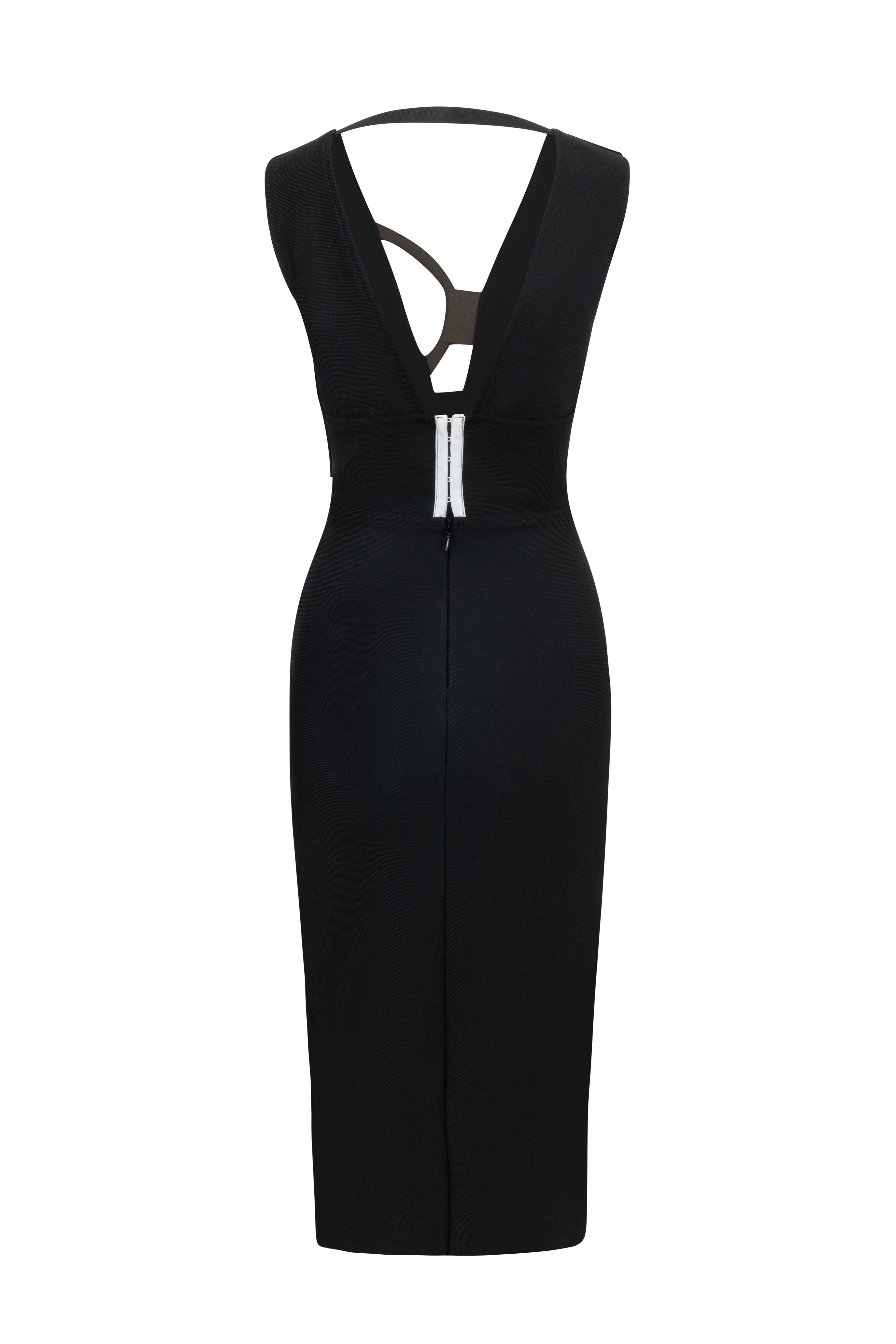 Be the center of attention with our plunge neck midi dress in black. Whether you're heading to a club event or a formal occasion, this dress is designed to make you look and feel amazing. The flattering silhouette hugs your curves in all the right places, while the plunge neckline adds a touch of sensuality. The midi length keeps it classy and sophisticated, making it suitable for any dress code.