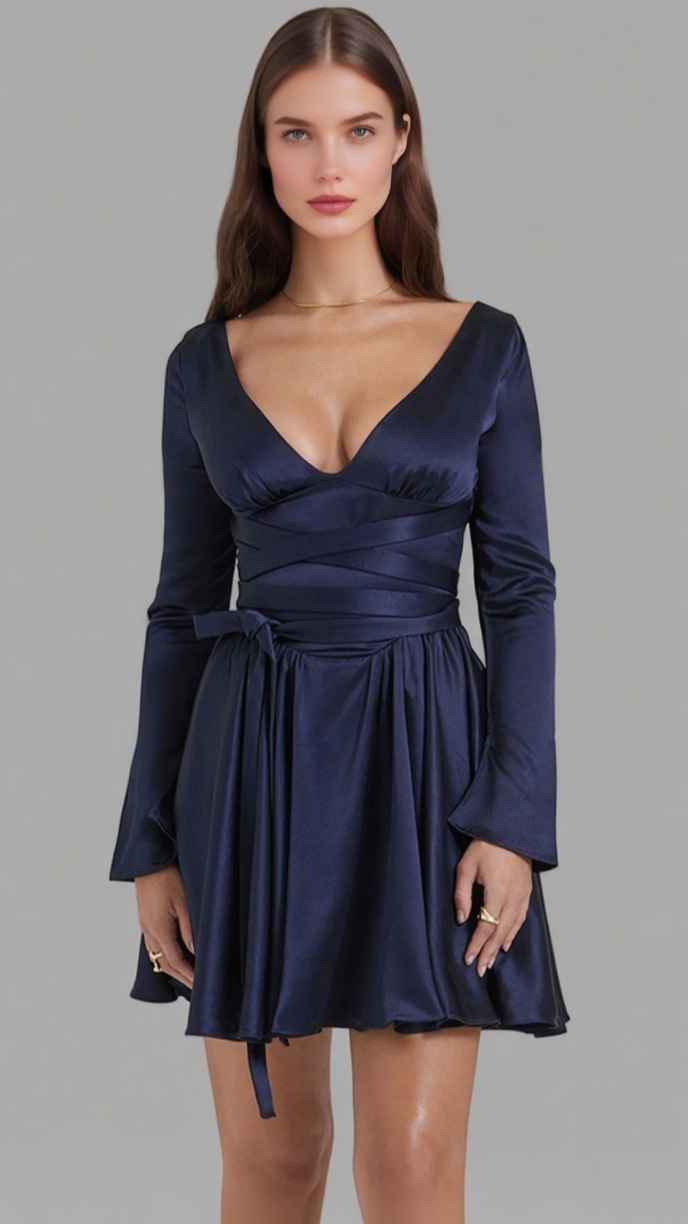 This navy plunge V-neck mini dress offers a sleek and sophisticated silhouette, perfect for evening events or stylish gatherings. Its deep V neckline enhances elegance while the mini length highlights your legs, creating a balanced and flattering look. Crafted for both comfort and style, this dress is a versatile addition to any wardrobe seeking refined minimalism with a bold touch.