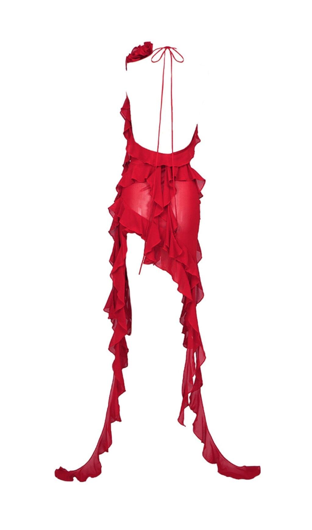 PLUNGING NECKLINE RUFFLE DRESS IN RED