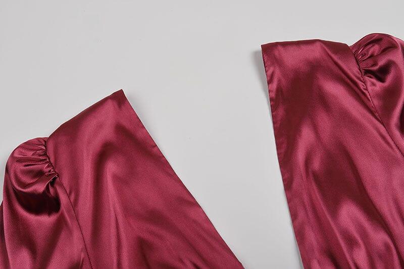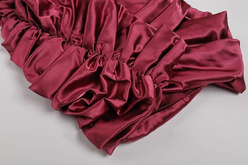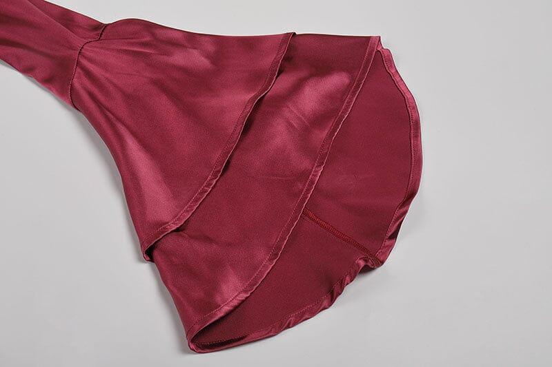 • Details: Long Sleeve, Tiered ruffle cuff, Deep plunged neck and back, Faux wrap skirt, Ruched skirt, Tulip hem