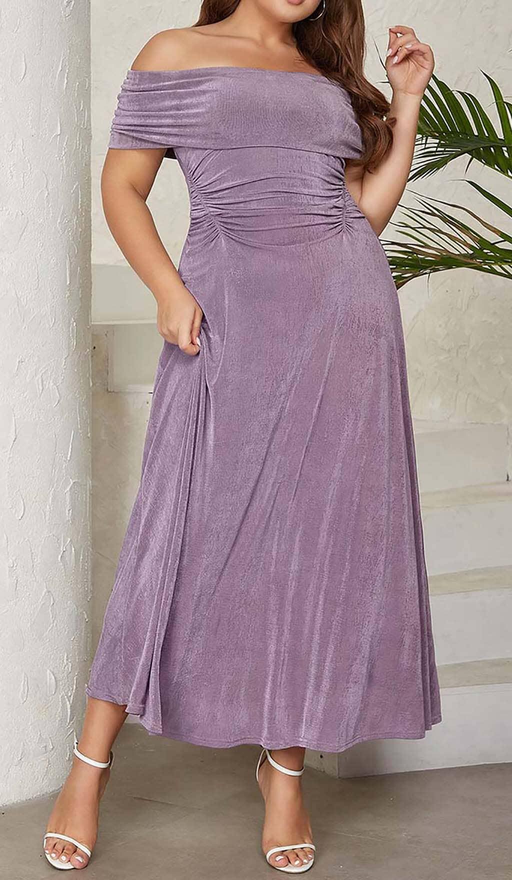Add a touch of elegance and sophistication to your wardrobe with our Plus Off Shoulder Midi Dress in Purple. This flattering and figure-hugging dress is designed to showcase your shoulders and create a stunning silhouette. The trendy off-shoulder neckline adds a flirty and feminine touch, making it a perfect choice for any special occasion.