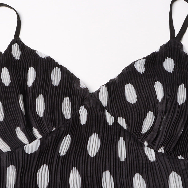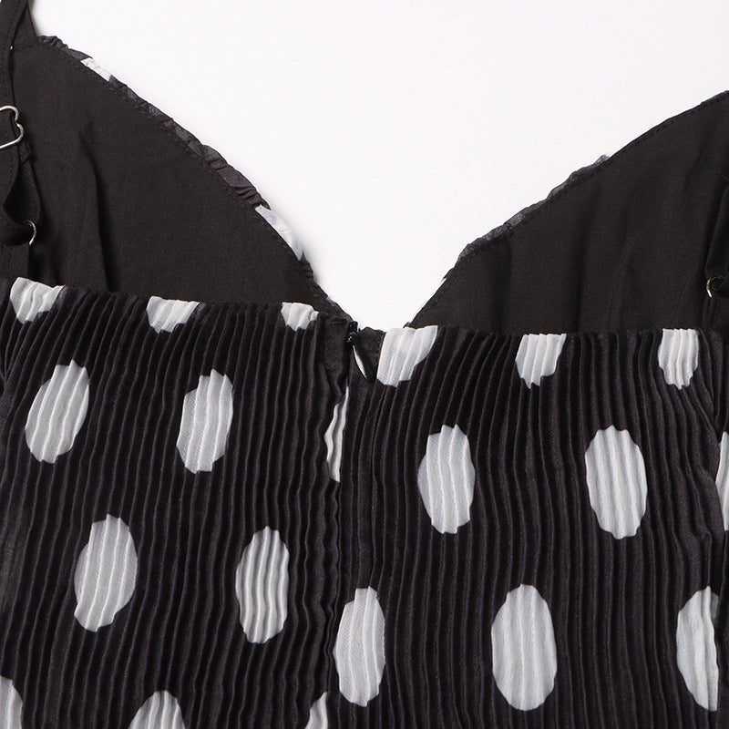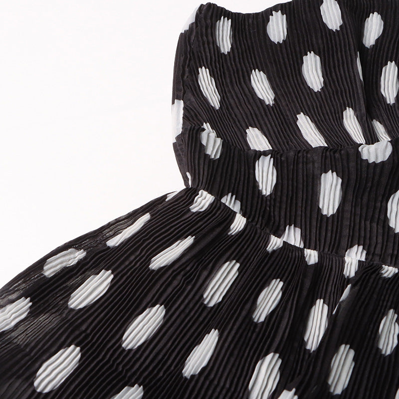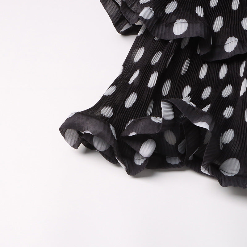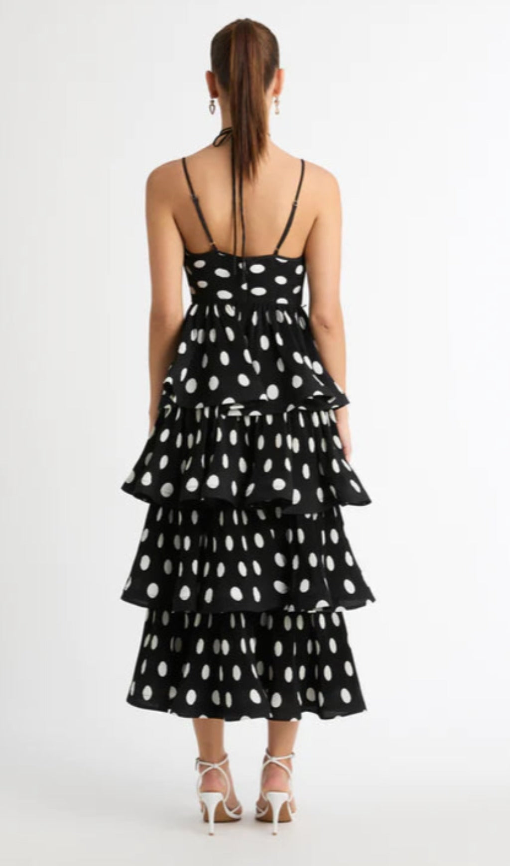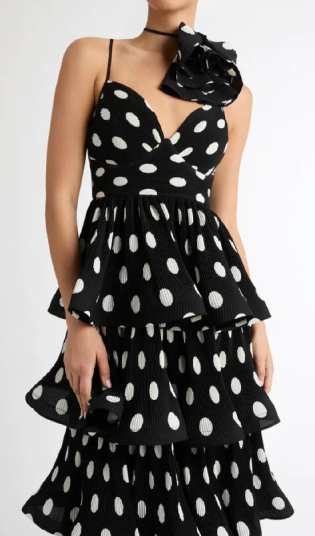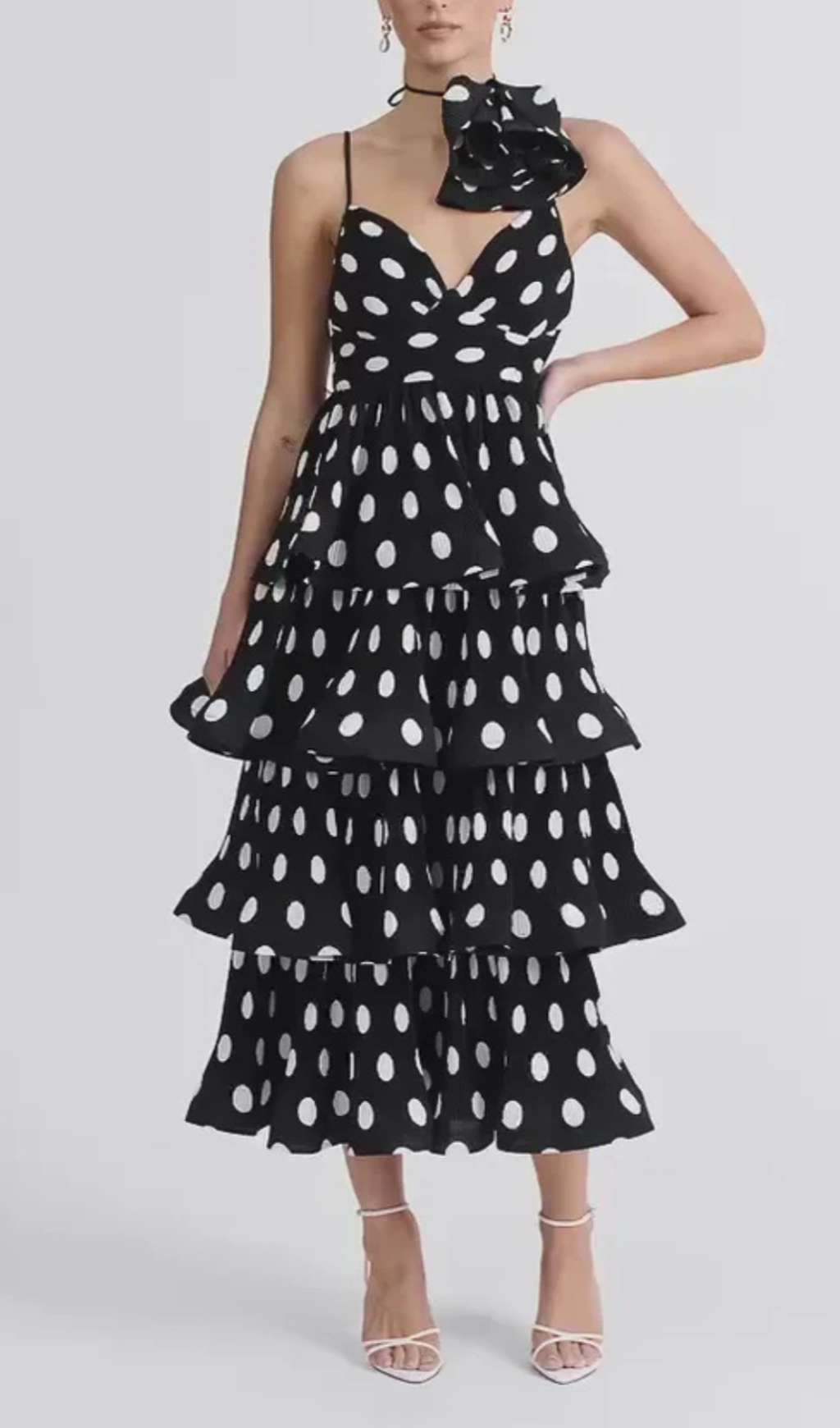 Voluminous silhouettes and playful polka dot prints make up the stand out Tiered Dress. Showcasing a fitted cut with adjustable straps, a layered ruffled skirt and detachable rosette flower.