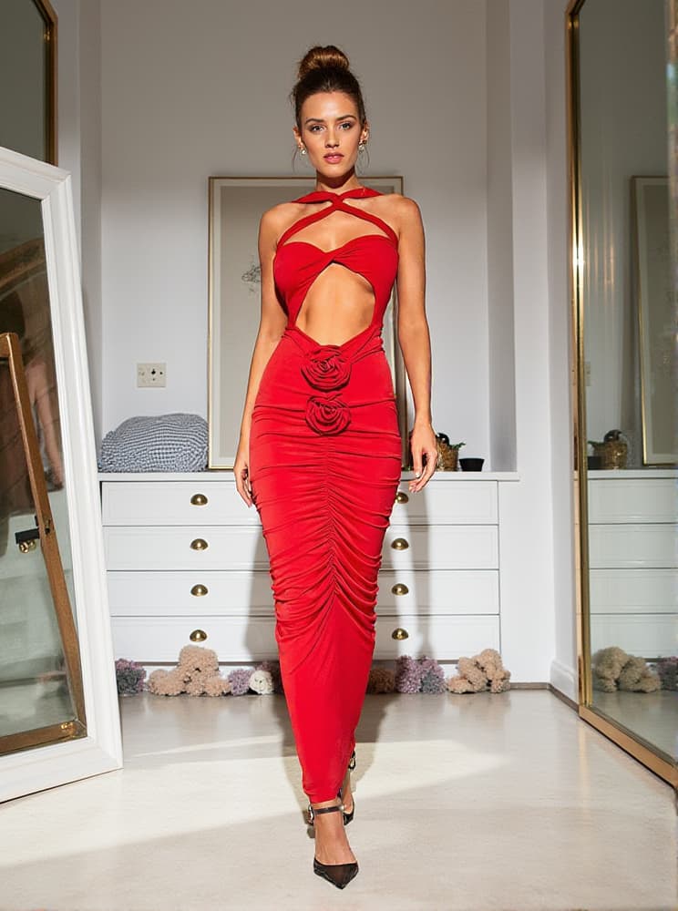 Elevate your evening style with our Pomeline Rose Bodycon Maxi Dress in Red. Crafted from a soft fabric with rose embellishments and a flattering ruched waist, this dress combines comfort with glamour. Featuring a cutout waist and maxi length skirt, this captivating piece is guaranteed to make a statement.