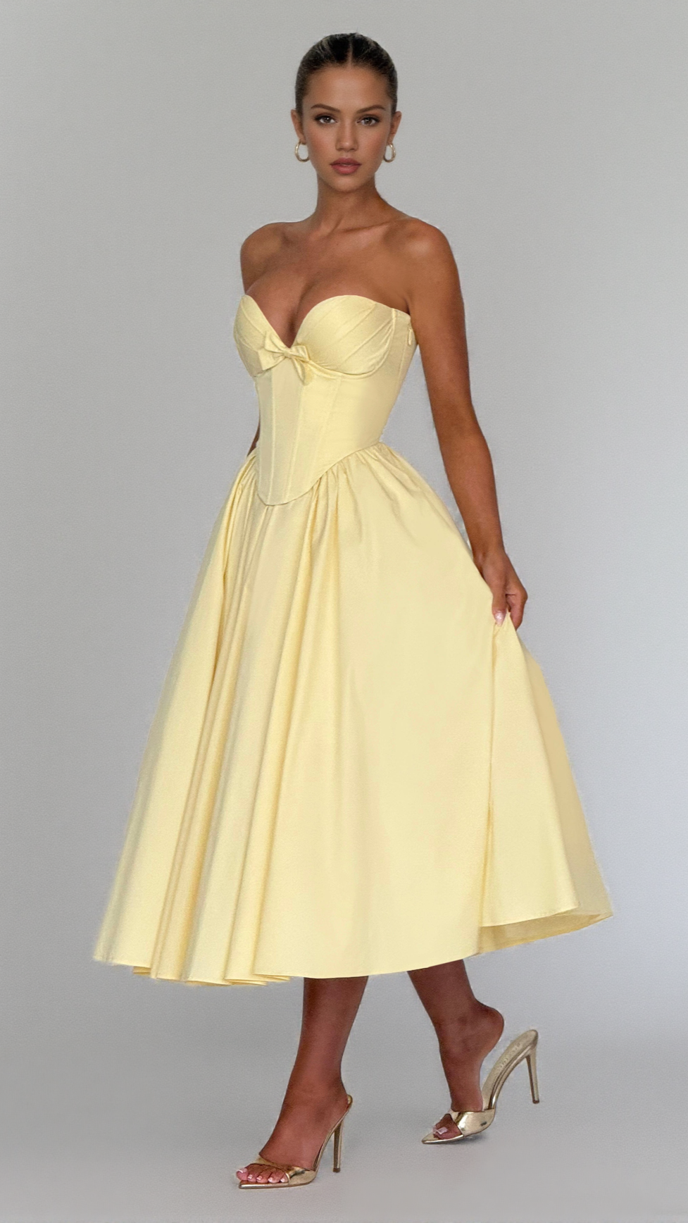 Indulge in the luxurious Prim Midi Dress in vibrant lemon. This strapless sundress features a plunge sweetheart neckline and pleated, underwired cups for support. The corset overlay with boning and bow detail add a touch of sophistication, while the lace up back allows for a perfect fit. The full, voluminous skirt with tulle lining adds an elegant and flirty element to this exquisite piece.