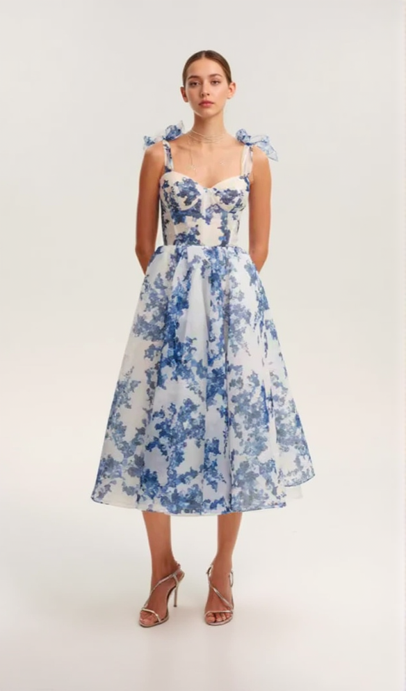 With its stunning blue floral pattern and flattering A-line silhouette, this dress is perfect for any occasion. Its midi length and comfortable straps make it both stylish and practical. Stand out and feel confident in this beautiful dress!