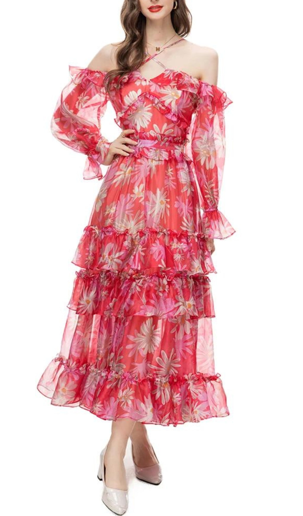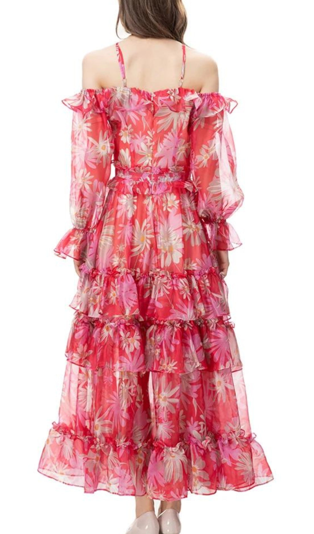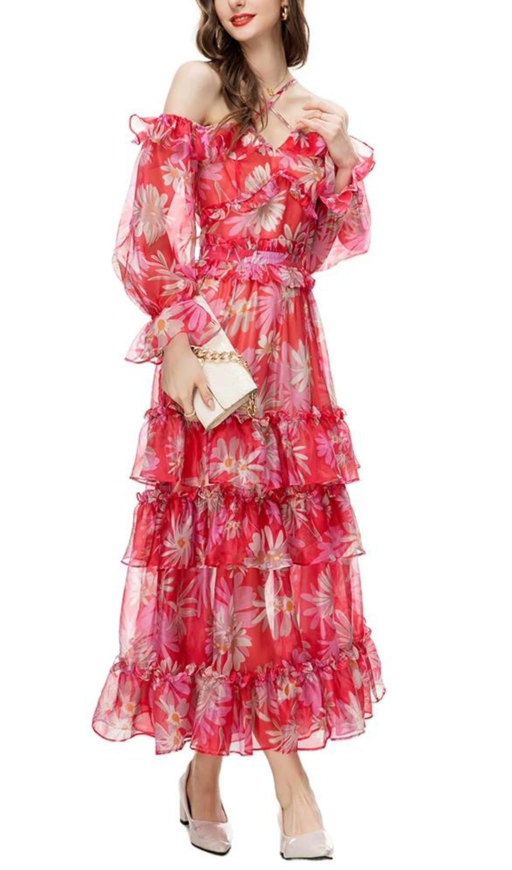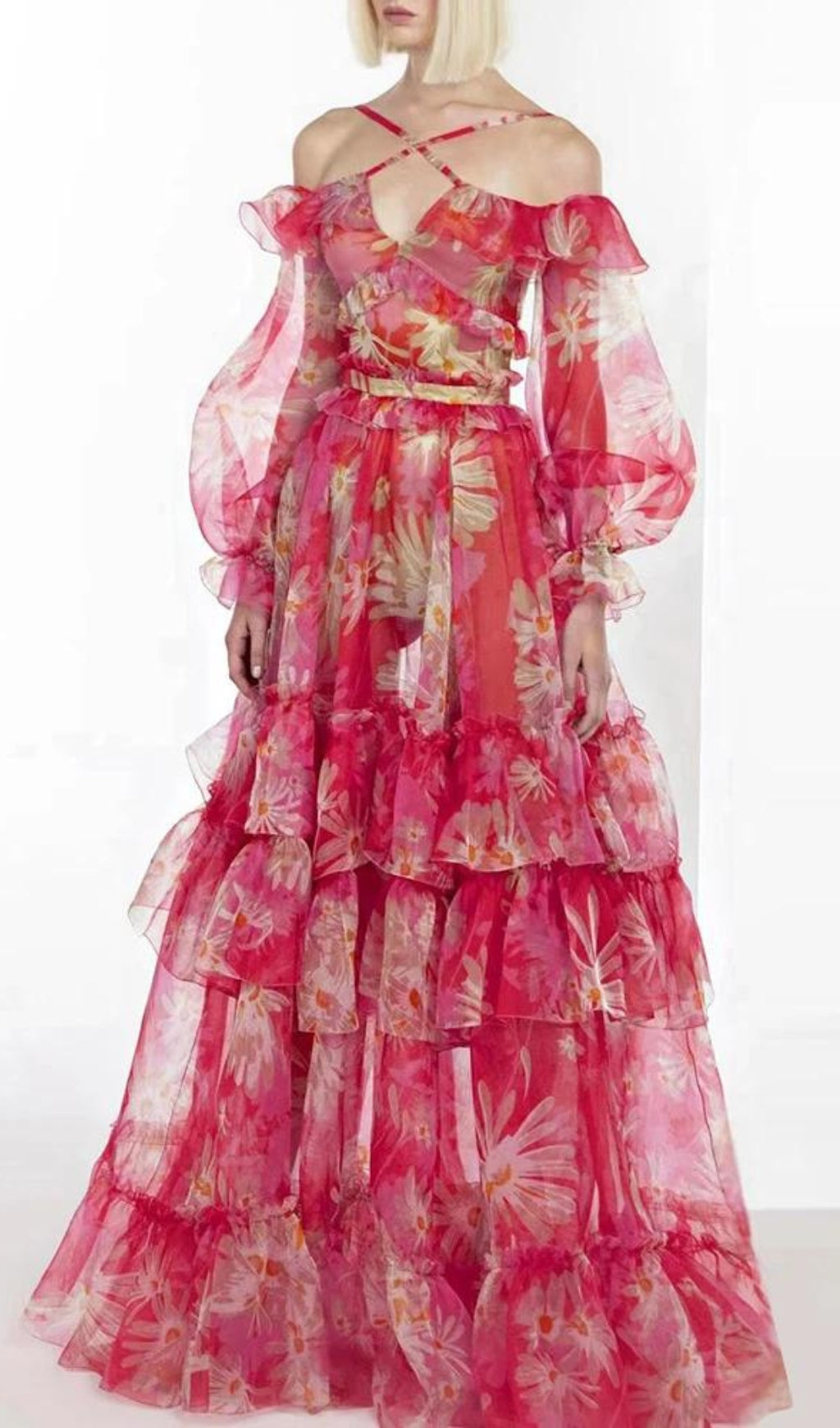 Look exquisite in this luxurious off-the-shoulder maxi dress, crafted from exquisite silk organza. Delicately printed, and featuring an elegant, figure-flattering fit, this dress is sure to make you feel like royalty.
