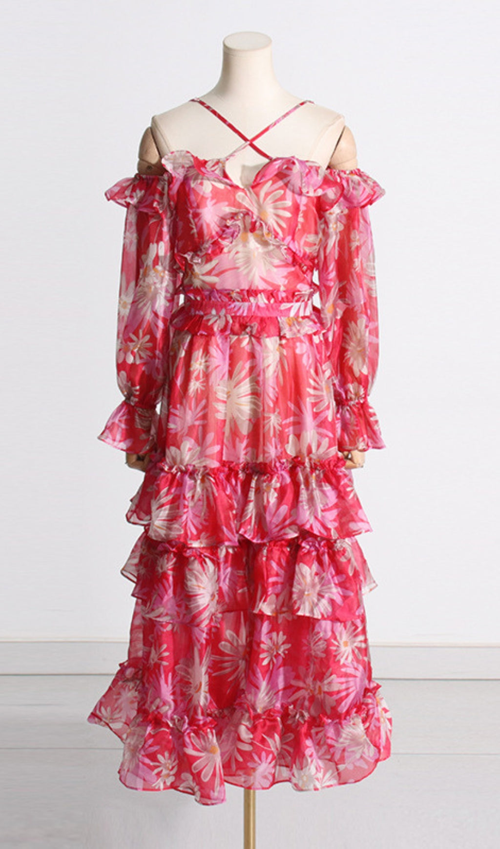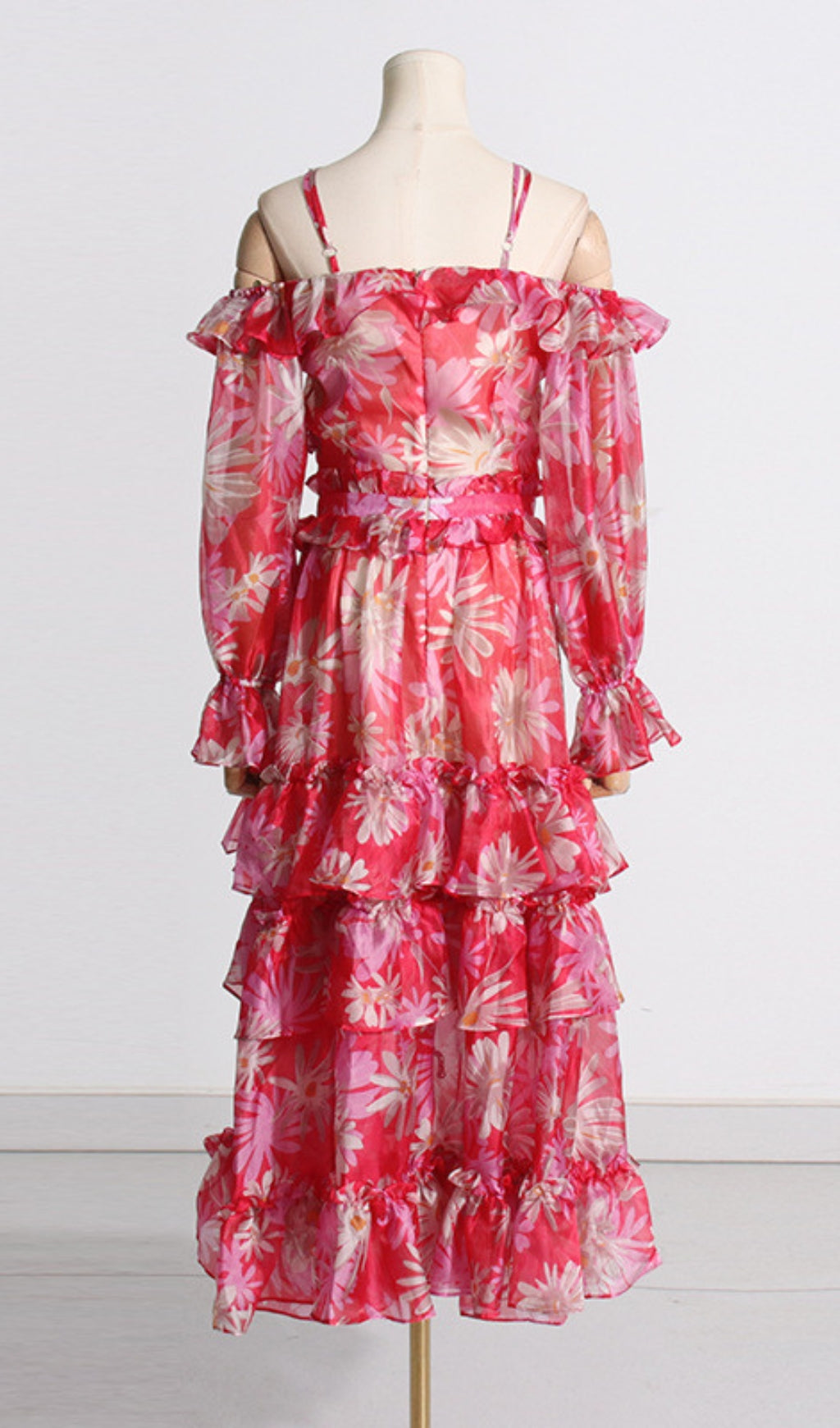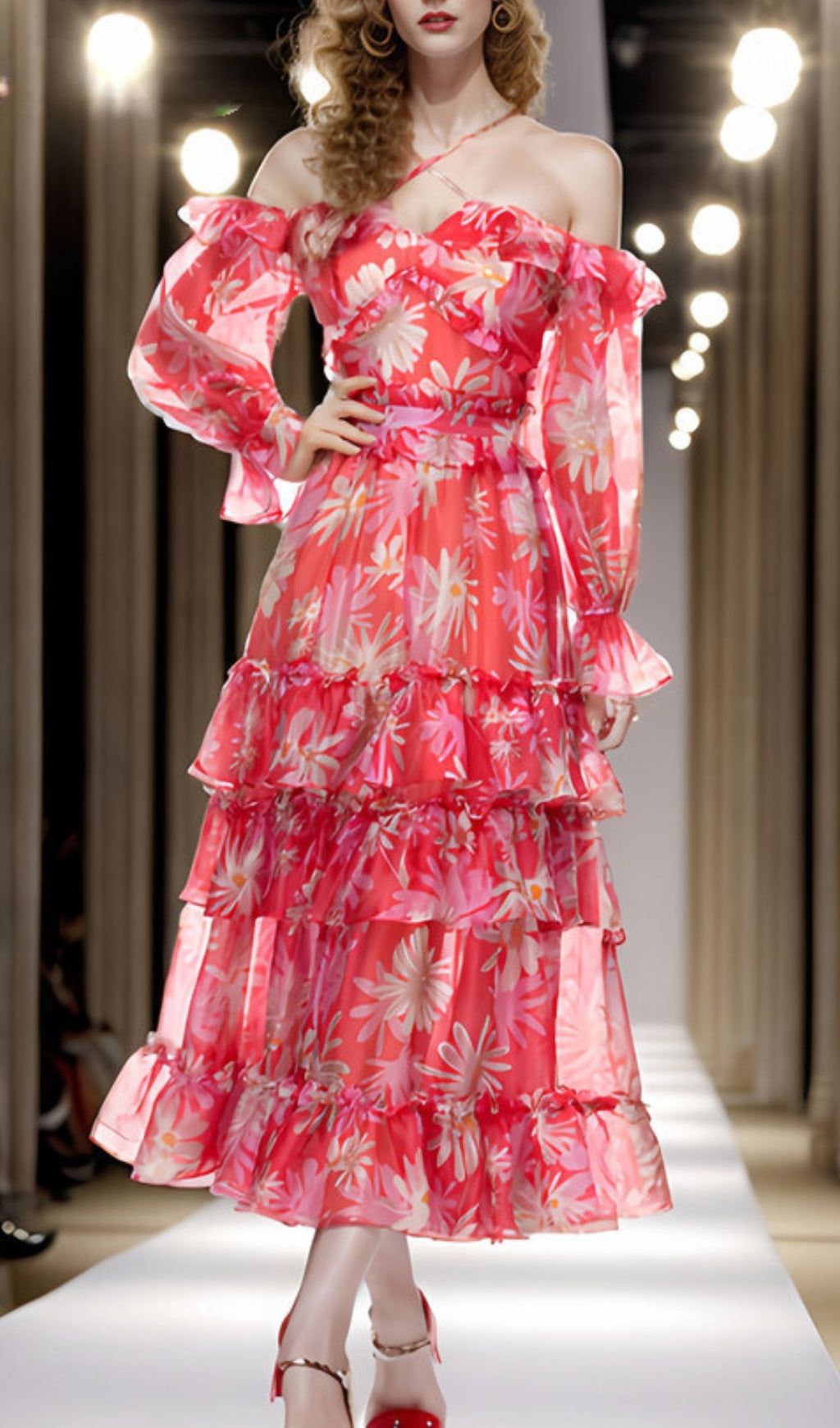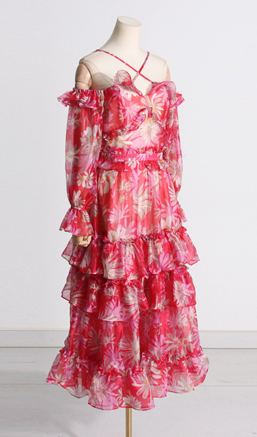 Look exquisite in this luxurious off-the-shoulder maxi dress, crafted from exquisite silk organza. Delicately printed, and featuring an elegant, figure-flattering fit, this dress is sure to make you feel like royalty.
